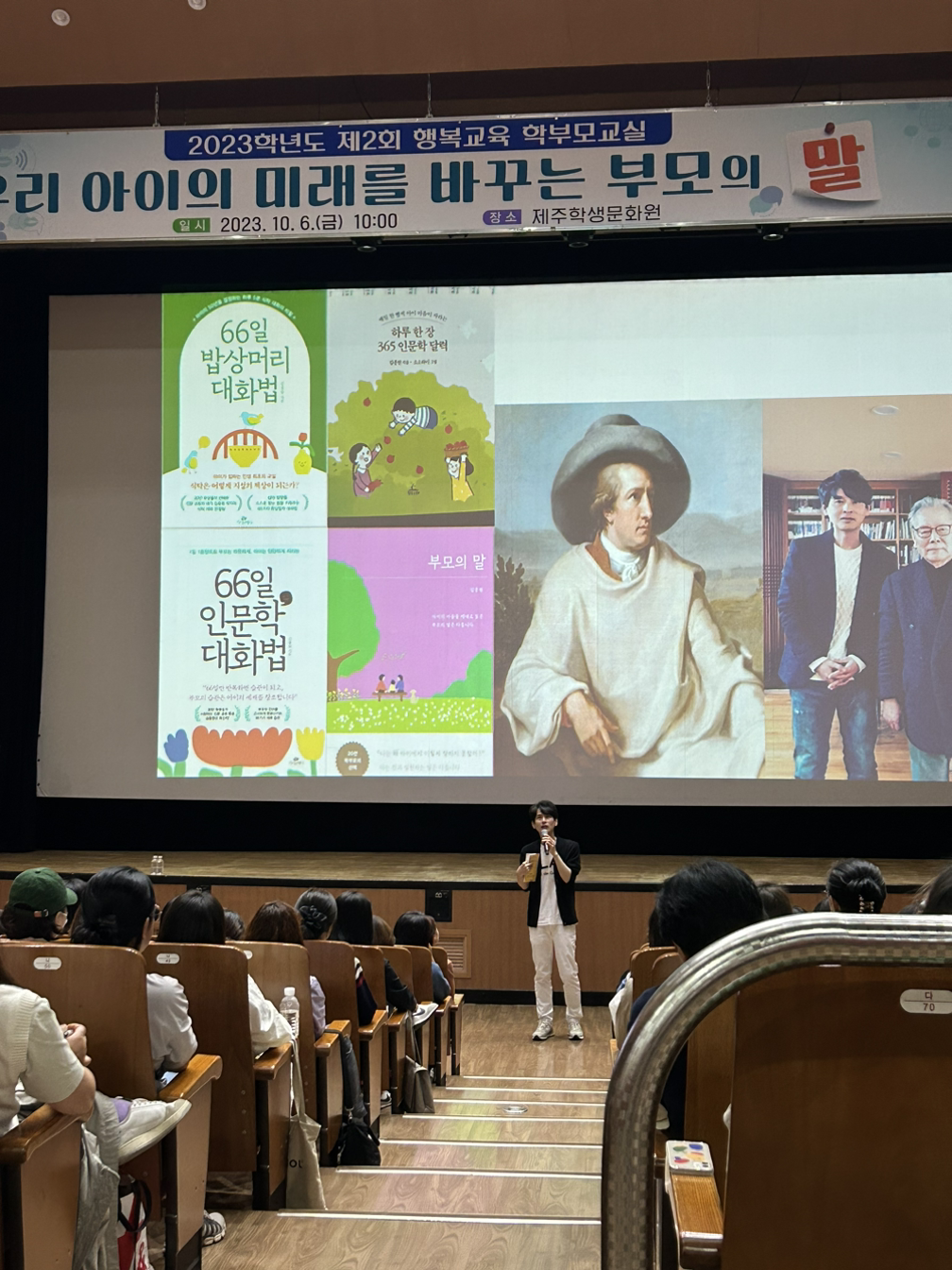 밖에 나와 계신 관계자 선생님께 한 참 질문하다 보니 여성 관계자 분들과의 교차점을 찾으며 책상 위에 놓인 김종원 작가님의 저서인 ‘66일 인문학 대화법’ 책을 발견하며 안도의 미소를 찾을 수 있었다. 현장 강연신청자란에 내 정보를 기재하고 보니 제주 삼다수 생수와 책 한 권을 챙겨 증정해 주다니 와 강연에 이렇게 뜻깊은 선물까지 오신 분들께 선물까지 주다니 역시 제주 교육청에서 학부모를 위해 준비한 남다른 스케일과 규모를 전해 받을 수 있는 입구에서의 현장감을 따스히 그려보았다.