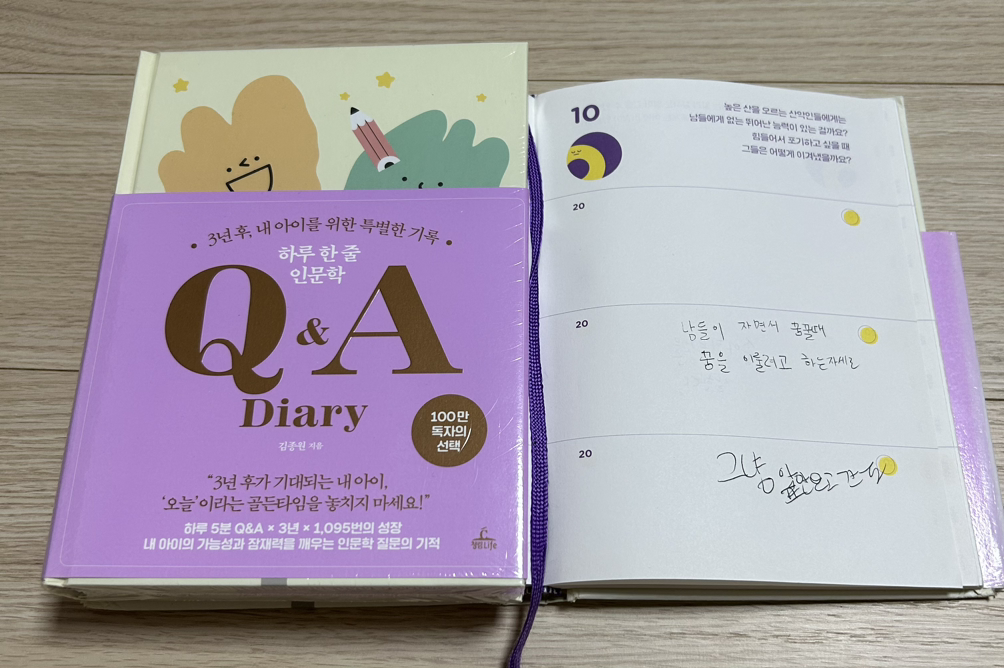 둘째가 함께 하는 어느덧 2년을 같이 지낸 김종원 작가님의 질문 다이어리 ‘하루 한 줄 인문학 qna 다이어리’ 책 표지가 많이 헐거워진다. 아니 앞으로 점점 더 그럴 것이다. 그냥 쉽게 벗겨버리지 못하고 늘 함께 하자니 이 표지와 책의 안부를 매일 묻게 된다.