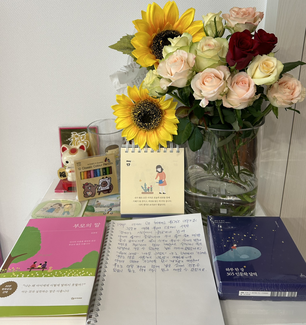“우리 표지 잘 있지? 이렇게 점점 아들과 나의 손길에 익숙해지는 당신과의 정을 쌓아 가는구나. 항상 우리 곁에서 고요한 모습으로 존재해 줘서 참 고맙다”