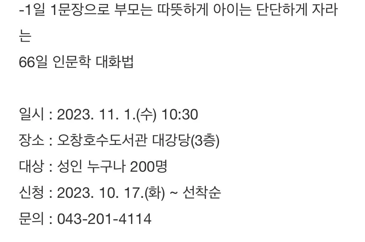 안녕하세요, 청주오창호수도서관 인문특강 소식 안내입니다. -1일 1문장으로 부모는 따뜻하게 아이는 단단...