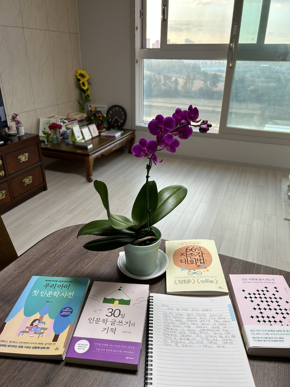 친정 엄마는 둘째 딸의 책상에 갖가지 꽃을 꽃아 가꾸시는데 혼자서 산책 갈 수 있는 딱 하나의 길에서 닿는흔치 않은 마트에서 난을 구입하셨다며 내 책상에 대한 애정으로 내가 없는 날 책상에 가득히 마음을 더해 놓아주셨다. 걷는 거리가 가며 30분 걸어 와서 30분쯤 이 화분을 집까지 조심스럽게 들고 다니셨을 엄마를 그 고요한 적막을 생각하니 이 꽃에 담긴 엄마가 바라보시는 도로와 길 나무와 경치가 담겨 내 책상과 책장이 더욱 소중해진다.