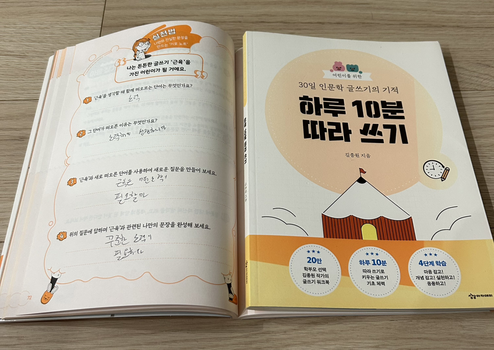 김종원 작가님 저서 인문학 워크북 시리즈 중 ‘하루 10분 따라 쓰기’를 읽고 중3 둘째 아들은 근육이라는 단어를 따라가며 생각을 정리해 보았다. 근육이라는 글자를 보고 노력을 상상했고 노력 중에서도 꾸준함이라는 예쁜 성장의 단어를 연상해 아이의 깊은 밤을 함께 나누며 나와 걷는다.