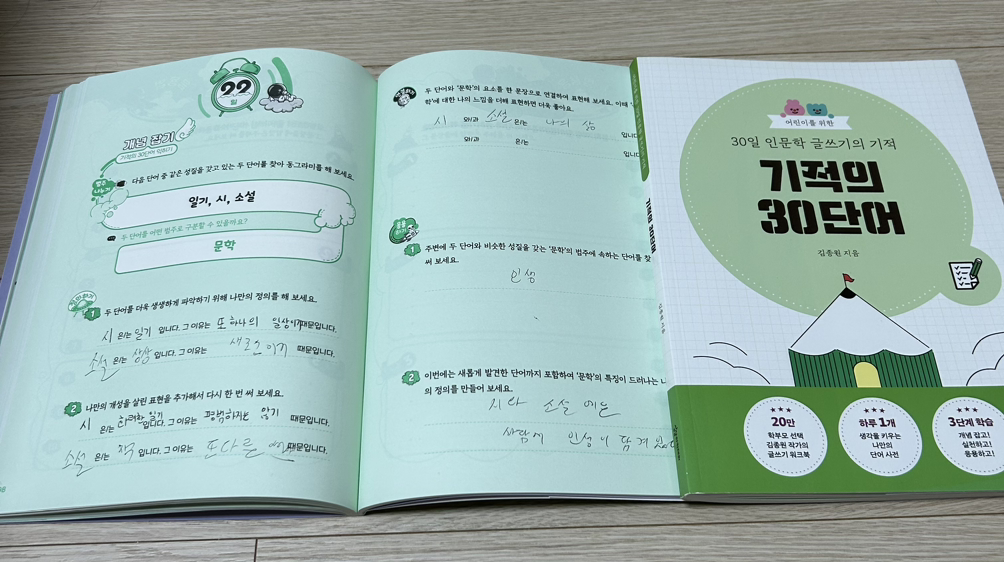 시는 일기 또 하나의 일기와 소설은 상상 새로움 시는 화려한 일기라서 평범하지는 않다 소설은 지구다. 또 다른 세계 시와 소설은 나의 삶이며 인생이라는 비슷한 성질에 속한다. 시와 소설에는 사람에 인생이 담겨 있다. 인문학 워크북 ‘기적의 30 단어’ 책을 보고 중3 아들 녀석이 쓴 2면의 질문과 글을 모으니 한 편의 근사한 글이 된다.