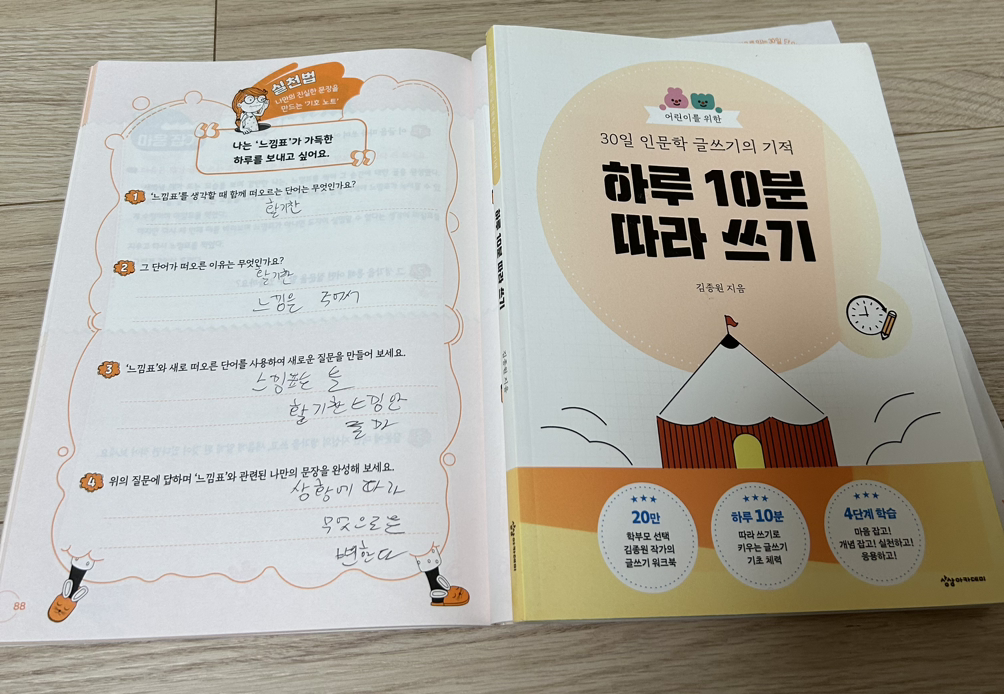 느낌표 하나로 활기찬 느낌을 상상하고 상황에 때라 무엇으로든 바뀌게 변하는 인간의 시선과 받을 수 있는 감정이라며 정리해 보는 중 3 둘째의 글을 볼 수 있게 해주는 인문학 워크북 시리즈인 하루 ‘10분 따라 쓰기’ 88p 에서 만나 본다.