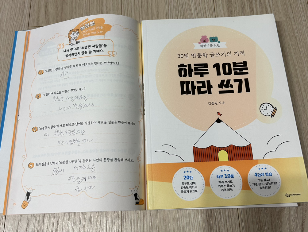 인문학 워크북 시리즈 ‘하루 10분 따라 쓰기’의 오늘 질문이 소중한 사람들을 생각할 때 떠오르는 단어를 상상하며 아들은 시간을 찾아갔다. 소중한 사람들과의 만남과 시간이 중요한 것처럼 소중하므로 더 가치 있는 시간을 지내는 법을 역시 지성 가득히 잘 자라준 둘째가 기특하게도 질문했구나.