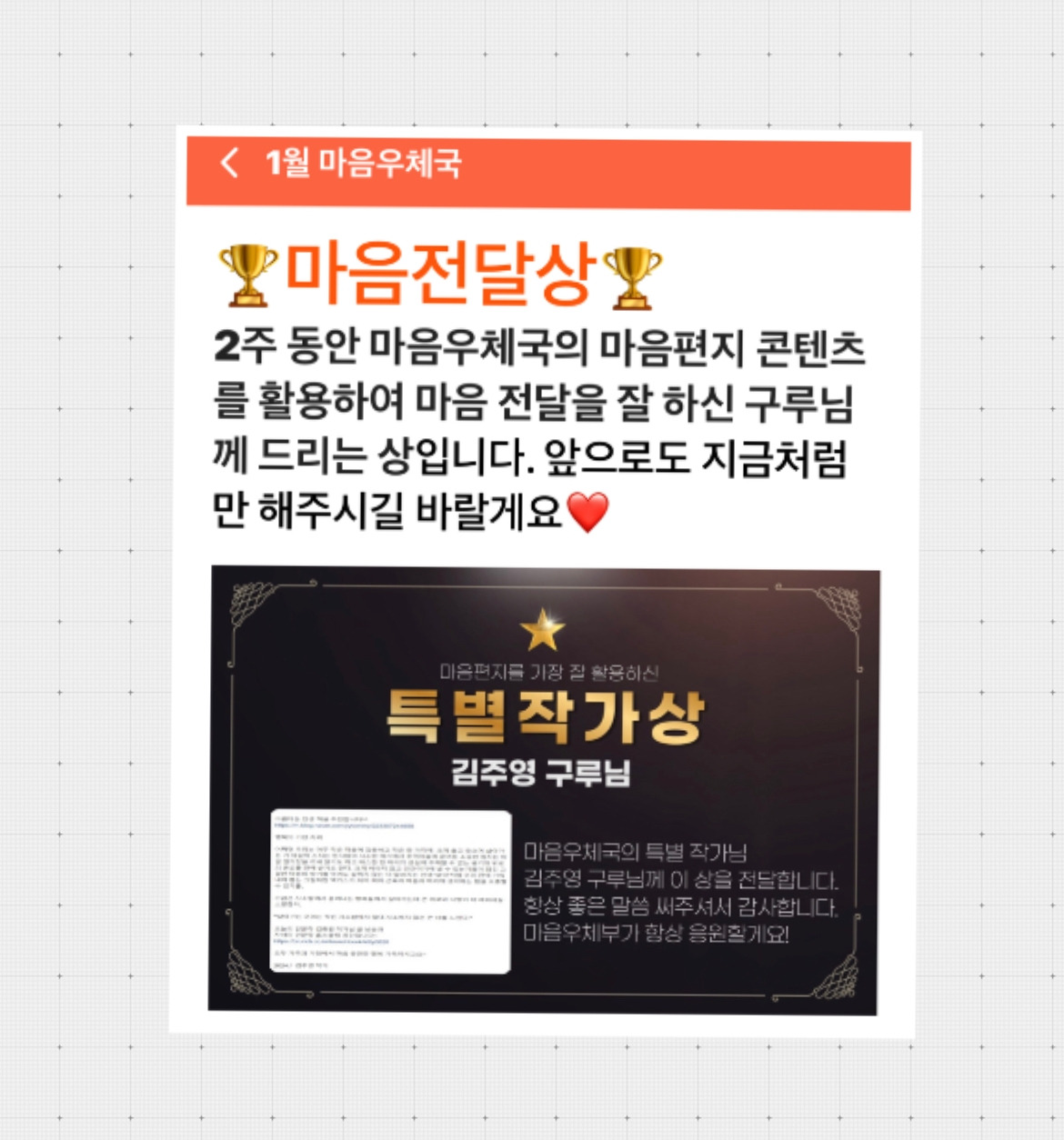인문학의 대가 김종원 작가님, 조승우 작가님과 함께 하는 <마음 우체국> 하루 한 줄 교환일기로 소통하는 인문학 프로그램 밴드 공간에서 명예의 전당 마음 전달과 특별 작가상을 수상했다. 정기적으로 부모와 자녀를 위해 고루고루 좋은 순간들을 놓치지 않은 마음 우체부와 이곳에서 보이지 않게 힘이 되어 주시는 작가님들과 선생님들의 배려와 시선의 깊이를 느낄 수 있는 건 피땀 눈물우표라던지 댓글 요정이라던지 마음우체국 우표에 엄마와 아이를 기대하는 좋은 마음 담아 오늘의 길을 걷는 이이와 자녀를 칭찬해 주고자 공간을 밝혀 주시는 귀한 마음의 온도가 깃든 아기자기하고 예쁜 상장을 정기적으로 내어 주는데 그런 뜻깊은 상을 내가 받은 거니까.
