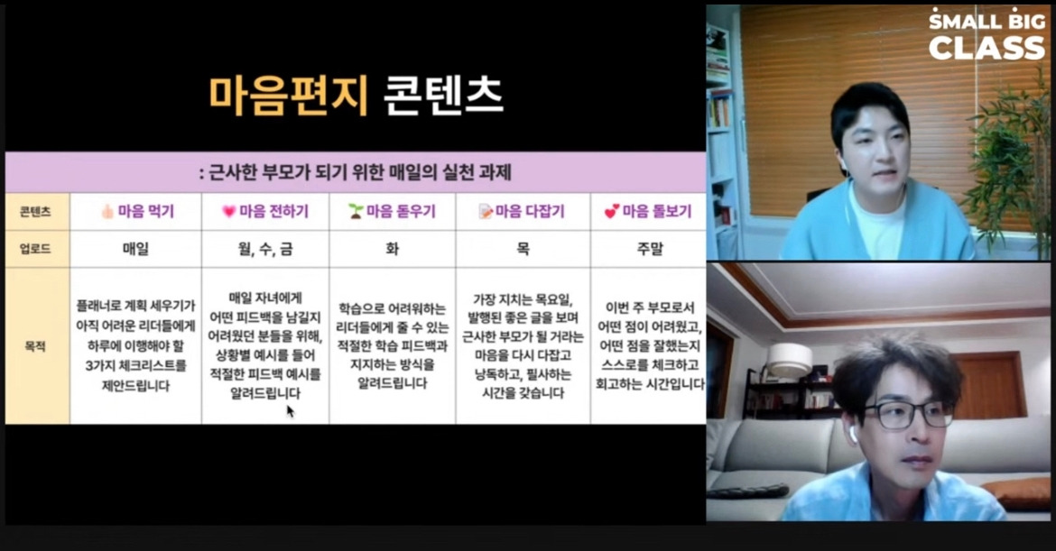 매달 매일 실천과 다른 미션이 주어지며 이곳에서만 만나 볼 수 있는 김종원 작가님의 글과 리더 (아이를 위한) 조승우 작가님 강의와 부모님을 위한 김종원 작가님의 강연을 통해 자녀를 올바르게 양육해야 할 부모의 말과 글 언어와 일상의 꾸준한 습관을 통해 삶의 내일이 달라지는 오늘을 준비하는 좋은 길을 안내해 주신다.