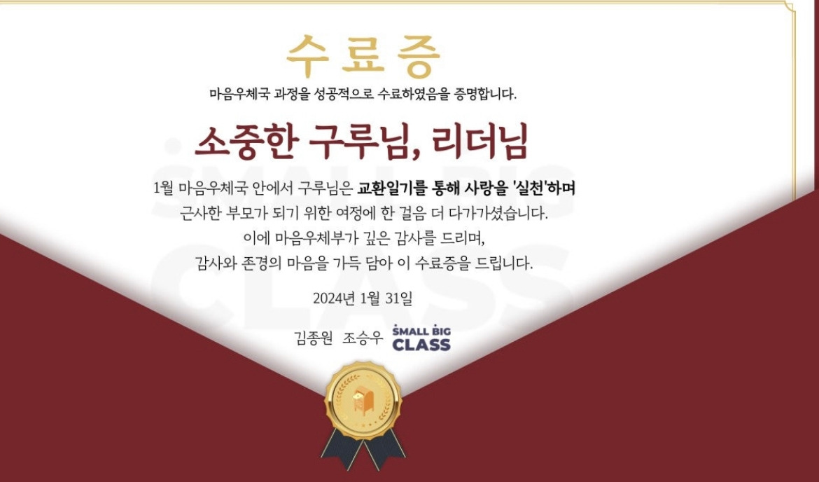 이렇게 빛나는 마감 수료증과 마음 우체국에서 보내온 한 통의 편지가 엄마 구루님들과 자녀 리더님들이 나아갈 오늘과 내일의 새로운 희망을 제시한다.