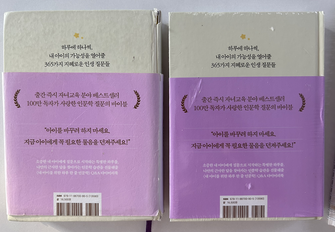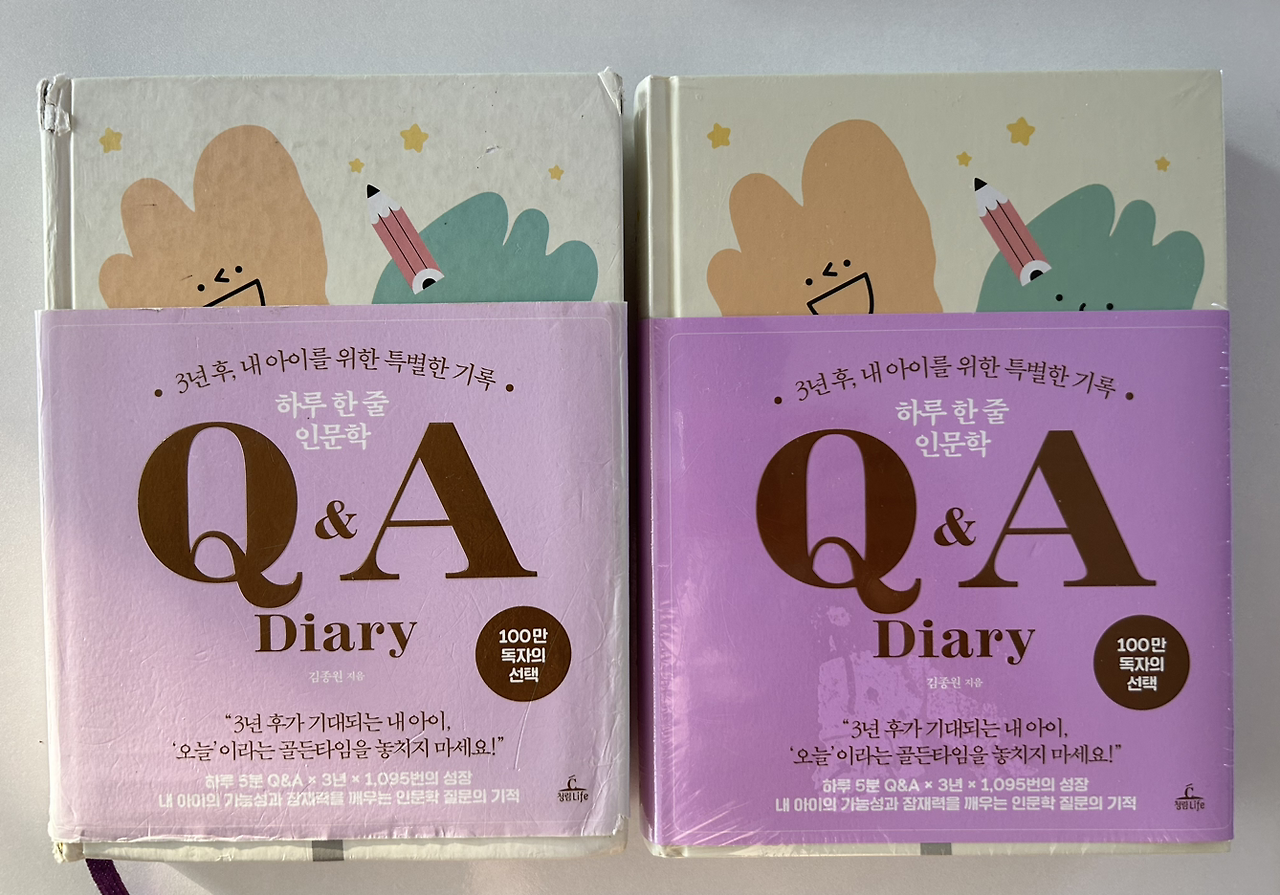 둘째가 함께 하는 어느덧 2년을 같이 지냈고 1년 365일의 기록이 3년의 길로 접어든다. 지성 김종원 작가님의 질문 다이어리 ‘하루 한 줄 인문학 qna 다이어리’ 책 표지가 자랑스럽게 세월에 안고 역사 속에 깃든 시간만큼 헐거워진다. 아니 앞으로 점점 더 다이어리가 그렇게 변주할 것이다. 겉 책 띠조차 쉽게 벗겨버리지 못하고 늘 함께 하자니 이 표지를 살피며 책의 안부를 매일 묻게 된다.
