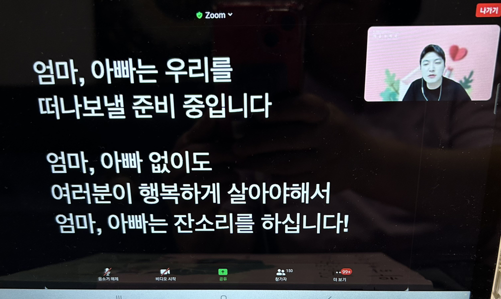 모두가 열심히 살고 있으나 새벽 4시 30 분 이전과 후에 하루를 시작하고 밤 8시가 되며 시력이 많이 침침해진다. 마음 우체국 라이브 OT나 인문학 강연이 있는 밤 시간에는 모니터 화면으로 자신의 얼굴을 공개하는 일이 나에겐 아직 쉬운 일이 아니다. 점점 약해지는 시력과 책상 앞에 앉아 작은 모니터 화면에서 시선과 몸을 고정해야 하는 시간에 강의를 보고 듣는 기록에 집중하고 싶어 나는 모니터 화면을 켜지 않고 강의를 보고 듣는 시간에 더욱 몰입하고 싶기 때문이다.