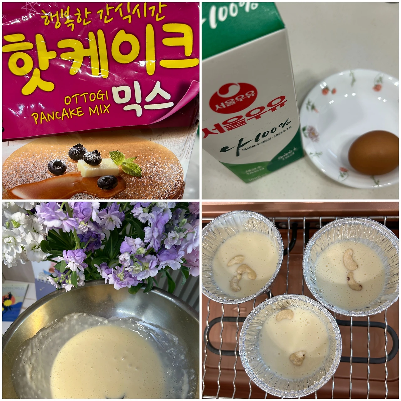 1. 예비 고1 아들이 산책 나가 핫 케이크 가루와 우유를 준비했네요. 달걀 1개와 캐슈너트 견과류 컵에 각 1개씩