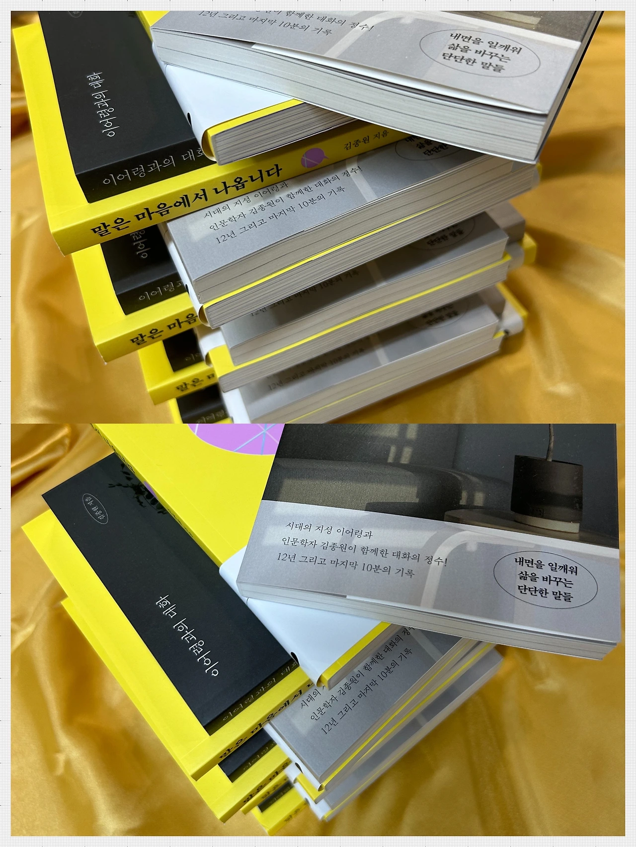 최근 출간된 김종원 작가님 저서 중 작가님의 14년 그 이상의 사색이 모여 탄생한 신간 이어령과의 대화와 말은 마음에서 나옵니다 이 2권을 선택하고 모두 11분께 각 각 드릴 수 있게 꼭 필요한 공간에 도착할 수 있도록 준비된 나의 선물 같은 하루가 기뻤었다.