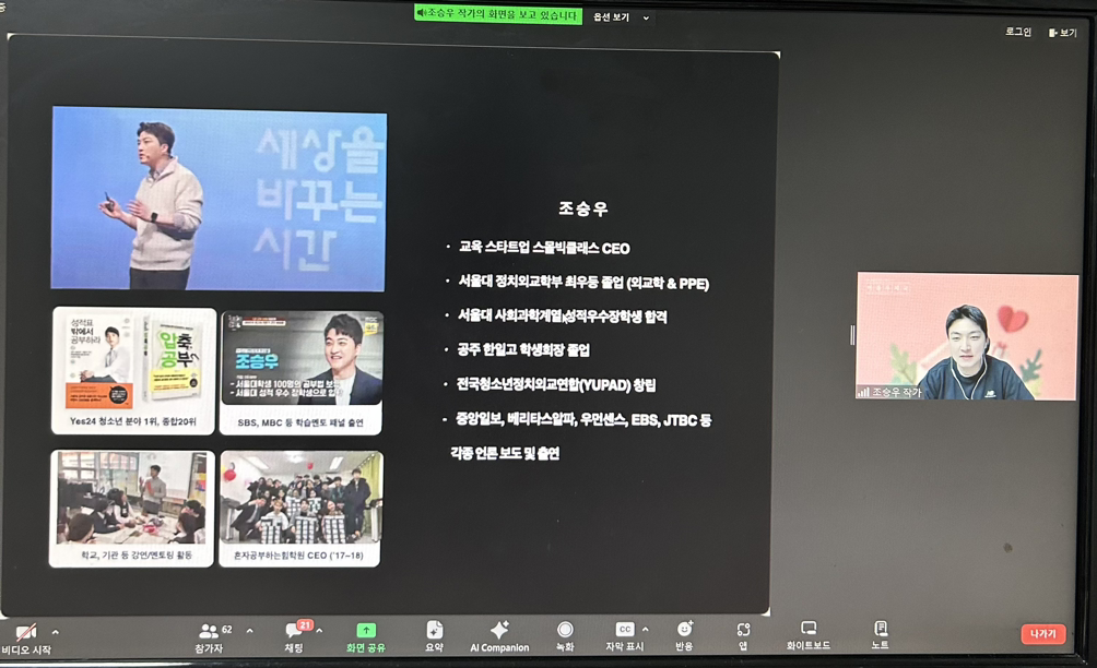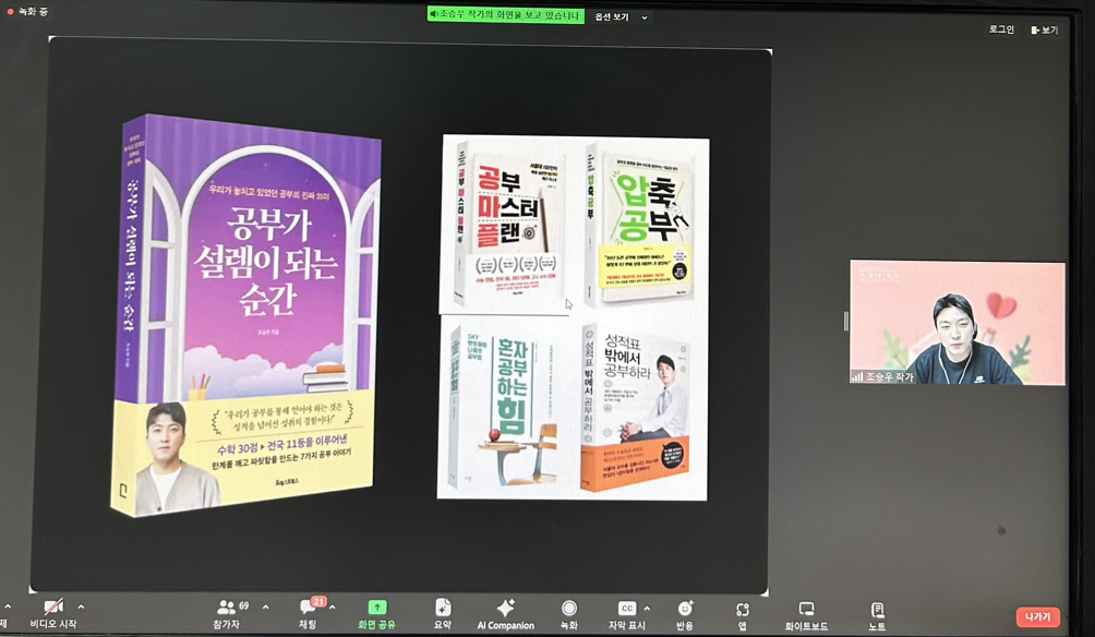 그간 조승우 작가님의 출간 저서 5권을 소개하자면 이렇다. 가장 최근에 출간된 조작가님의 어머님께서 보여주신 믿고 기다려주신 큰 사랑 덕분에 어머님께 드리는 마음으로 쓰신 <공부가 설렘이 되는 순간> <공부 마스터플랜> <압축 공부><혼자 공부하는 힘><성적표 밖에서 공부하라>의 저서로 그긴 삶에서 이룬 열정과 실패 그리고 결국 해내며 쓰신 조승우 작가님을 글과 책으로 만나볼 수 있다.
