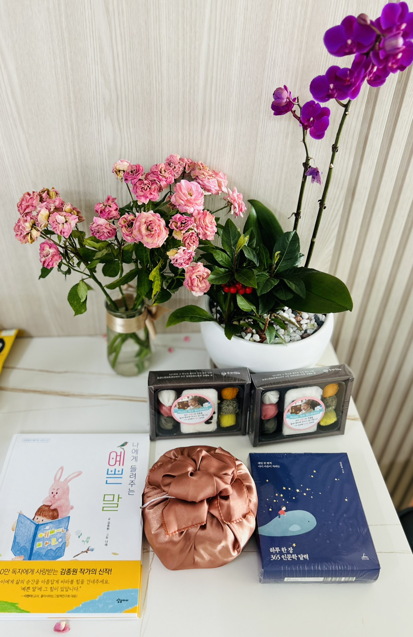 초인종 소리에 나가보니 다음 달이 돌인데 잔치를 할 식장이 없을 정도로 행사가 많은 봄이라 미리 이번주에 내려와 치르셨다며 아가 이름과 엄마 아빠 이름까지 쓰여있는 아기자기한 떡과 선물을 주고 가셨다. 어쨌든 이런 귀한 떡을 그냥 받을 수 있나 아기에게 꼭 필요한 첫 시작의 걸음이 되기를 지성의 선물인 김종원 작가님의 <하루 한 장 365 인문학 달력>에 그림책 동화 <나에게 들려주는 예쁜 말>을 골라 행복한 마음까지 작게나마 담고서 전할 수 있으니 (극구 사양하시는데) 이 얼마나 감동적 순간이 탄생하는 건가