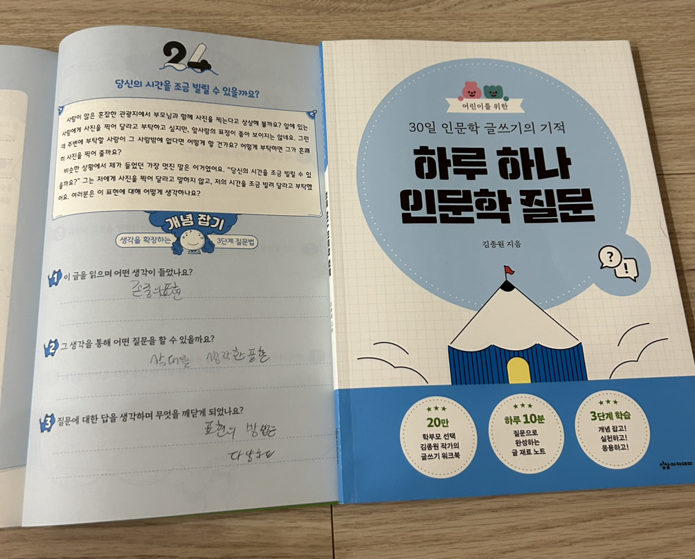 당신의 시간을 조금 빌릴 수 있을까요? 관광지에서 사진을 찍을 때 누군가에게 부탁하는 제안의 표현인데 김종원 작가님이 써주신 인문학 워크북 <하루 하나 인문학 질문> 글과 질문을 보고 고1 아들이 찾아낸 생각이 바로 존중의 표현이다. 상대를 생각한 표현이자 그 방법이 다양하다는 것 생각만 해도 순환이 되는 소통의 방식들 역시 발견하기 나름이며 같은 상황에서 어떻게 조금 더 예쁘고 다르게 말할 수 있는지 인간이 매일 쓰는 말과 글 속에 깊고 넓은 세계가 살고 있음을 바라볼 수 있는 대목이다.