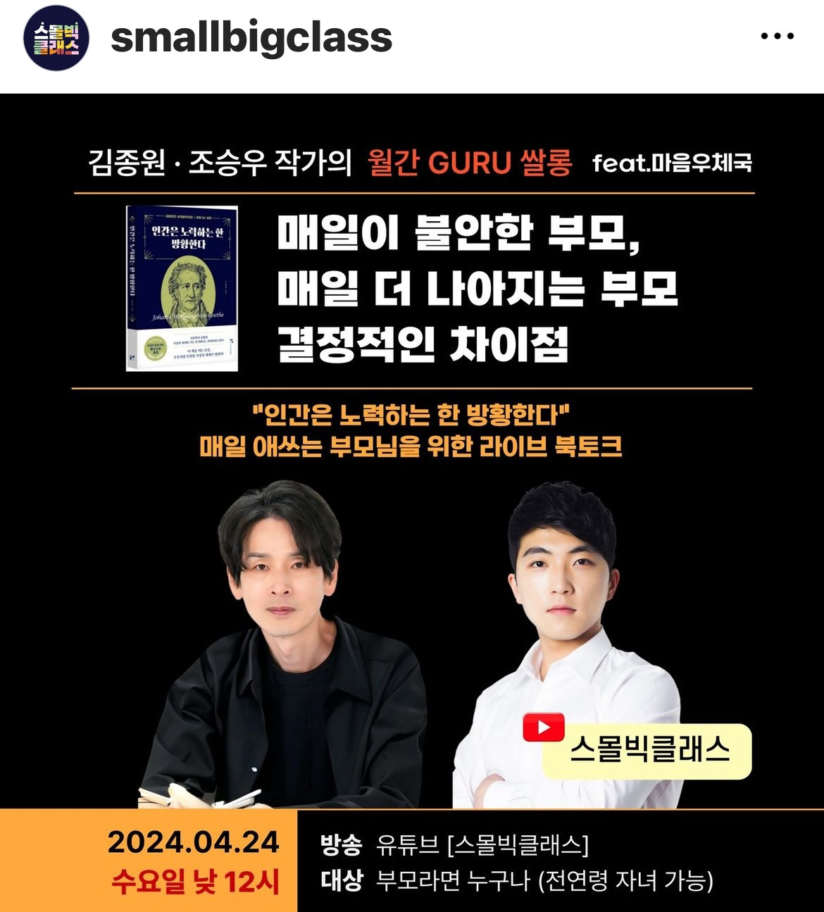 2024. 4월 벌써 마지막 만남 <마음 우체국 조승우 작가님> 과 구루,부모님을 위한 라이브 소통 강연을 보며 늘 그렇듯 그저 아는 것과 몸소 실천한 체계적인 학문과 지식에서 찾은 질문을 통해 보다 나은 지혜로운 나와 아이 사랑하는 사람과 실천의 소통과 성장의 길을 안내하고 소개해주시려는 스몰빅 클래스 그럼에도 공부란 일상의 변화와 시작이며 작은 하나의 꾸준한 습관부터 출발한다는 진실의 문장과 언어를 따라 재차 질문하며 깨닫는다.