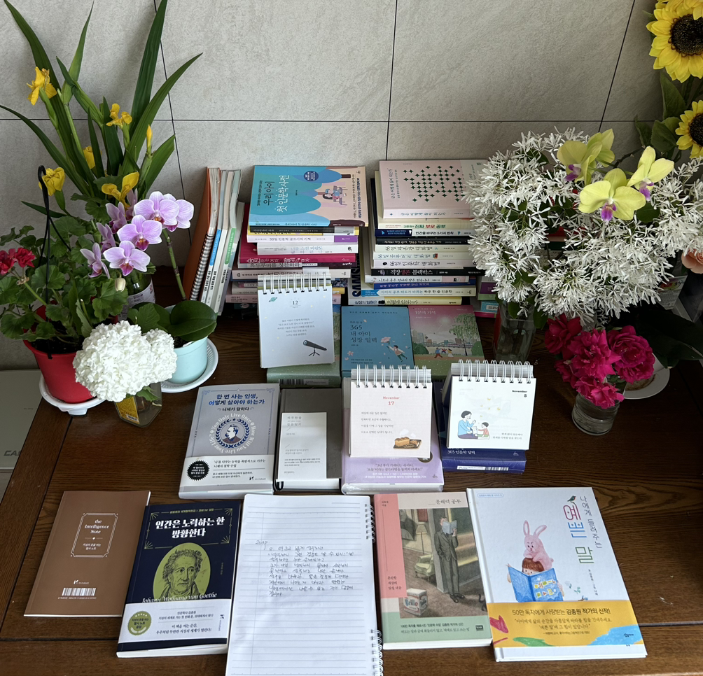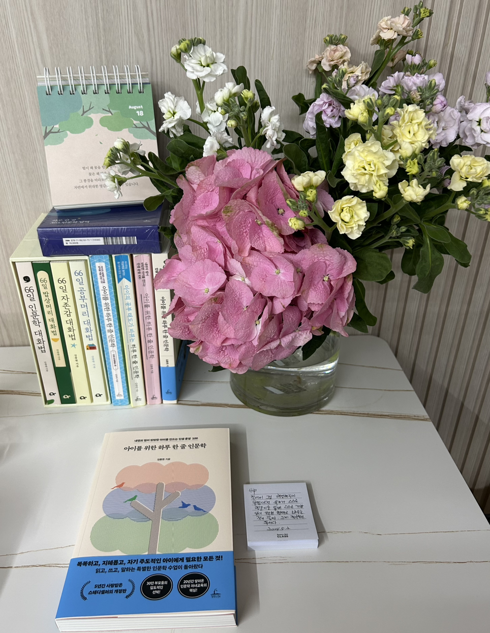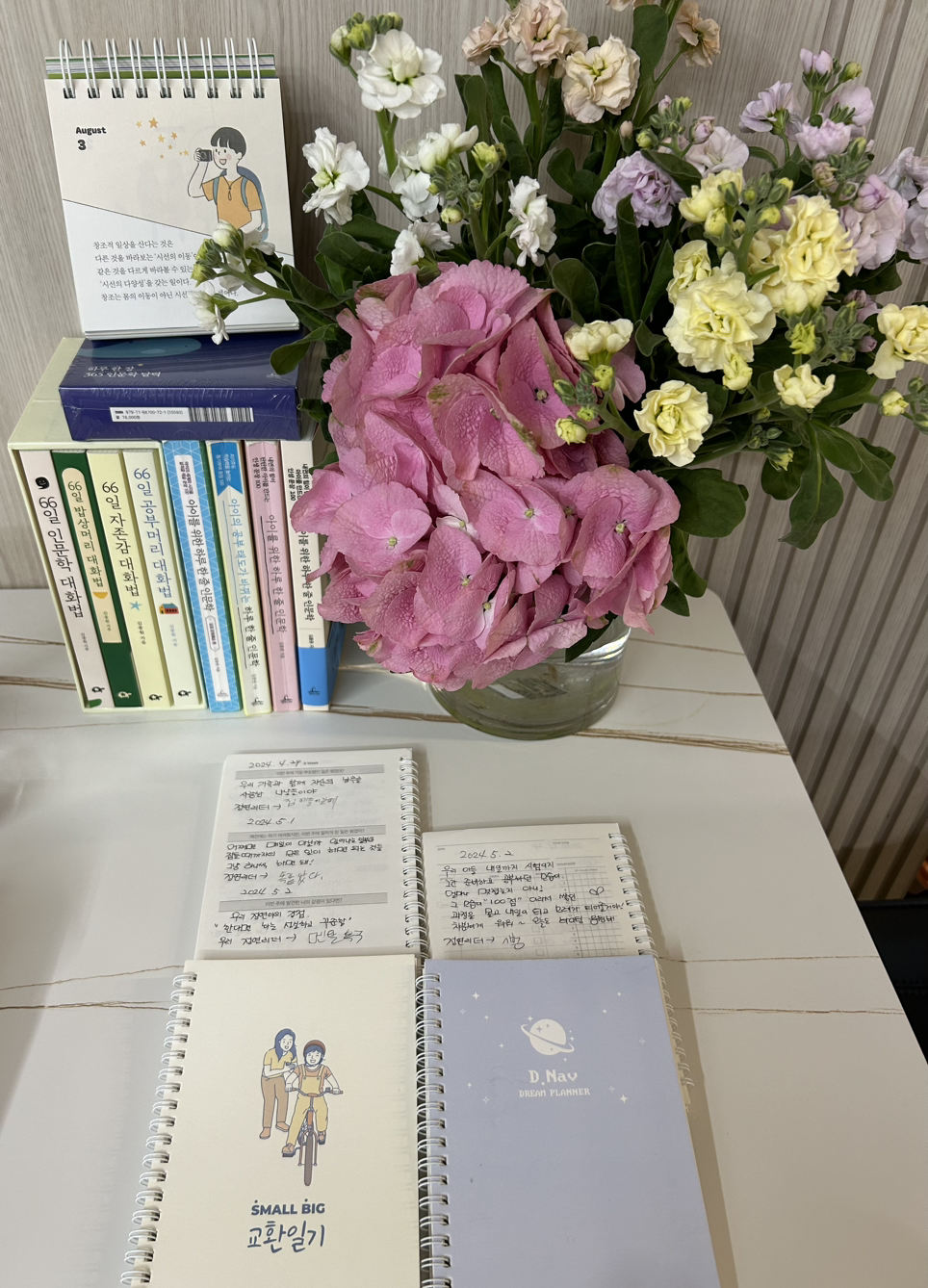 요즘 자주 뵙지 못하는 아는 분이 출하한 스토크 꽃이 더위에도 꽃이 자라 한다발 사오는 내내 마음과 기분이 향기에 젖었고 큰 애가 집에 오며 가장 예쁘게 보였다는 핑크 수국 한 송이까지 이렇게나 가득 풍성했나. 그래 가끔은 기나긴 복잡한 말보다 한 송이 꽃으로 지금의 마음을 전하는 길이 있으니 나는 그렇게 시간과 마음을 글로 써 카톡문장으로 잔잔하게 전했었으니까.
