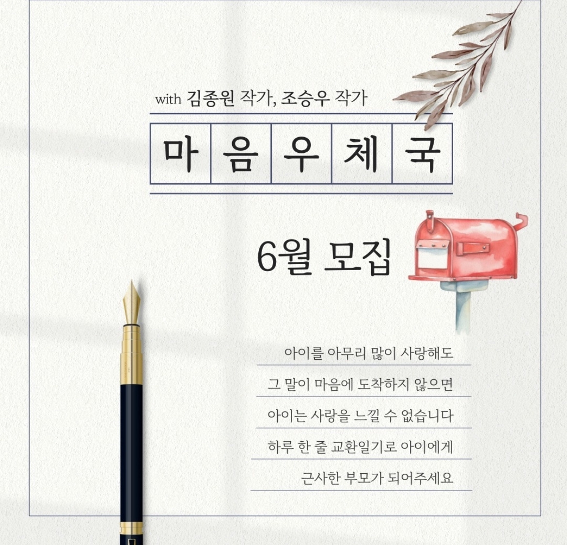 마음 우체국에서는 다양하게 구루와 리더님들을 사랑하는 시간을 준비한다. 김종원 조승우 작가님의 강연 라이브는 물론 가족처럼 개스트 구루와 리더님을 초대해 1주년 축하와 감사 인터뷰 영상까지 준비하셨다니 마음이 아니면 안 되는 살아있는 일들이 끊임없이 탄생하는 것 같다. 사랑하는 부모와 아이의 점점 나아지는 내일을 위해 마음 우체국에서 함께 하는 근사한 월간 모집을 늘 소개하게 되고 6월 모집을 함께 하시길 소망한다.