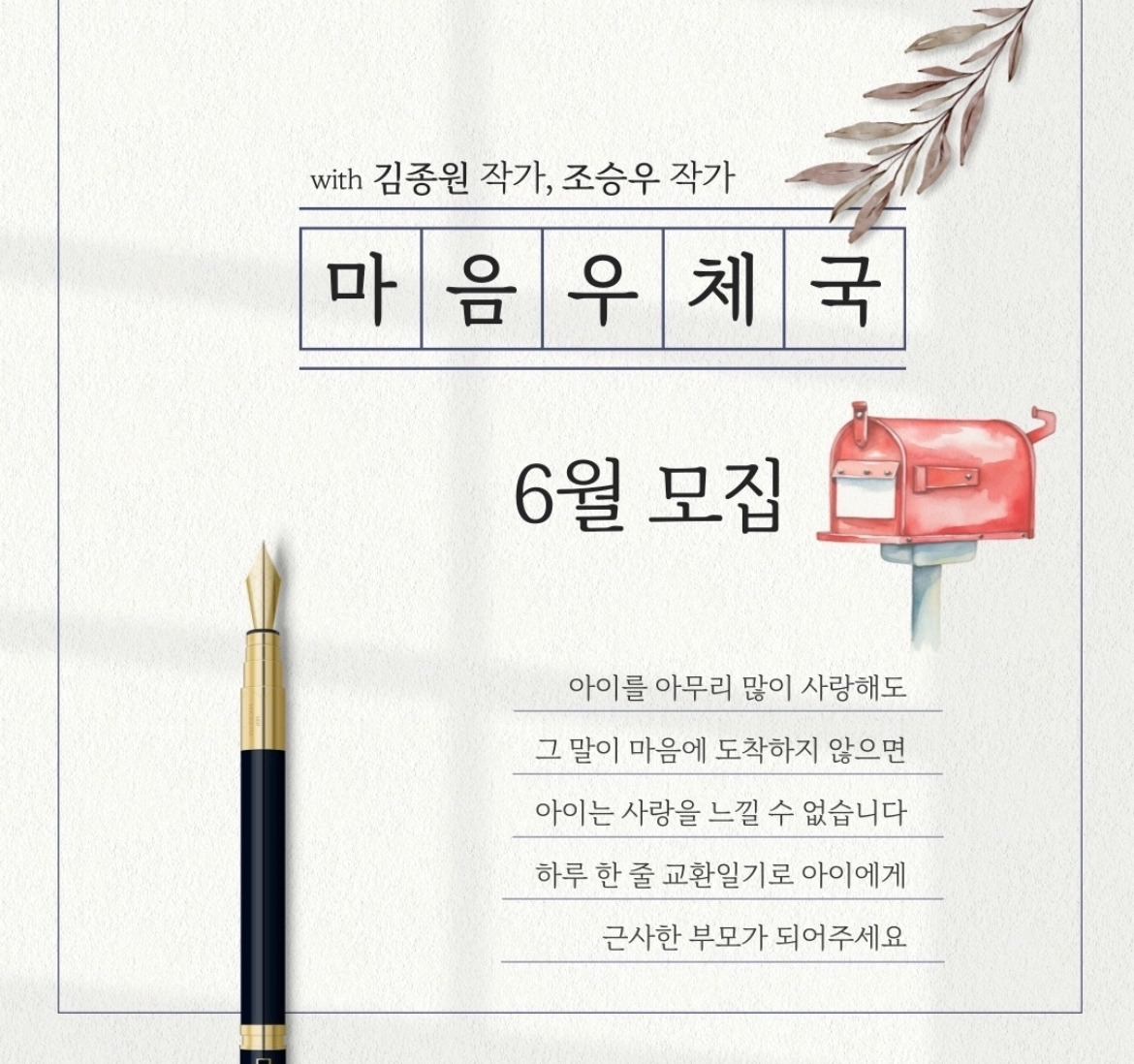 마음 우체국 김종원 조승우 작가님 소식과 6월 모집 안내를 확인하세요^^