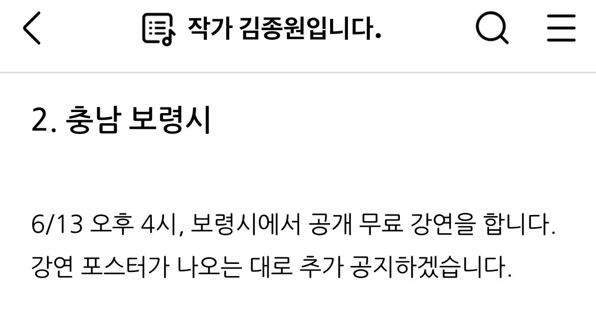 6월 4일 부산 영도구청 김종원 작가님 인문학 공개 강연, 6월 13일 충남 보령시 인문학 공개 강의