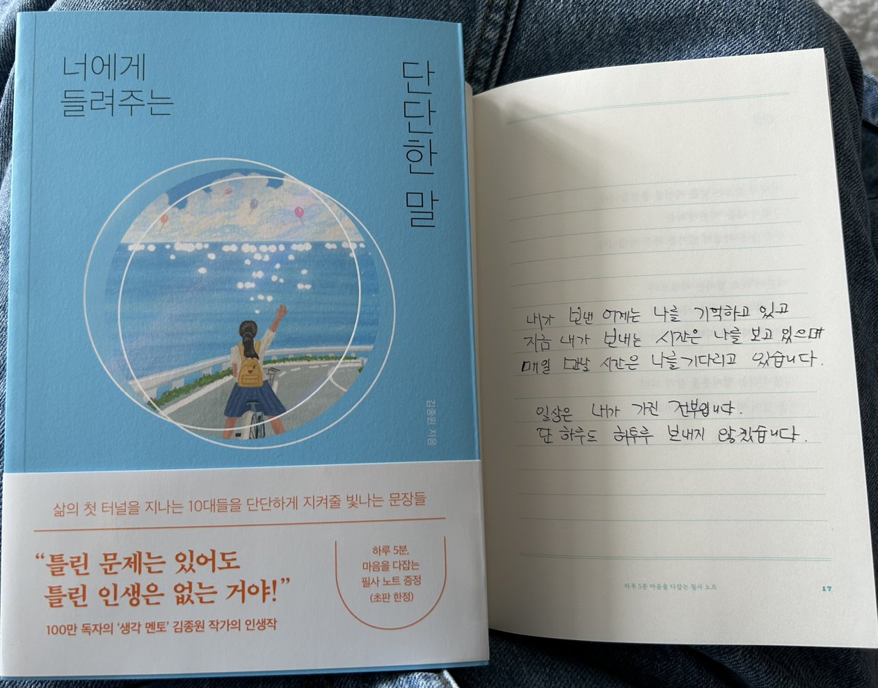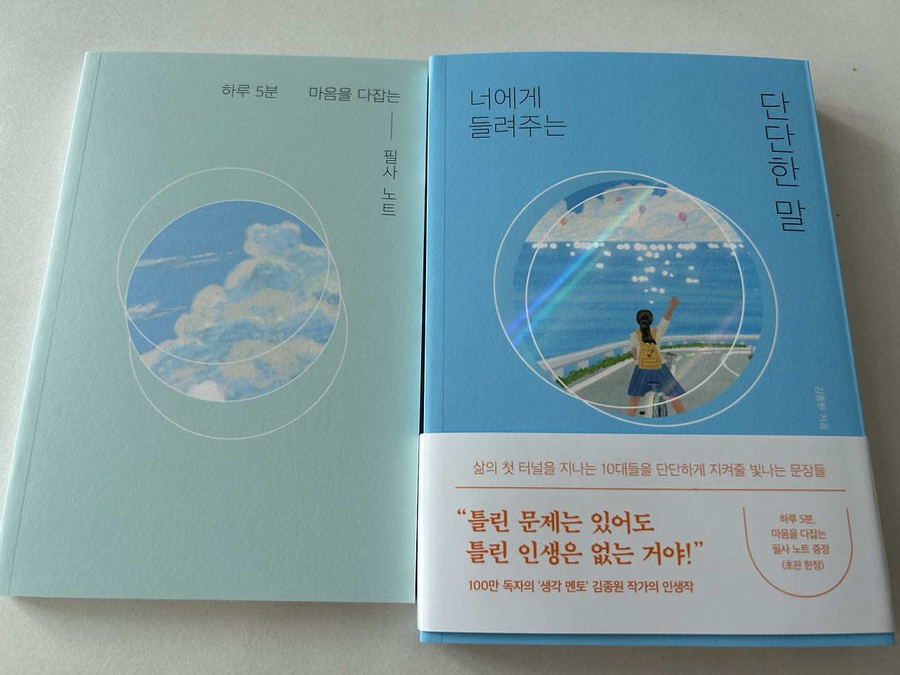 가끔 무게에서 가벼움에 책이 반갑다.어딜가도 어디에서나 쓸수 있는 문장 한 구절과 필사를 기다리는 여백 공란이 준비되어 있는 필사노트 부록이란 나처럼 이동하는 곳곳에서 어느 때라도 보고 만나고 필사하기에 감사한 무게의 느낌이다. 하루 5분 마음을 다잡는 필사노트를 즐겨하기에 편리하도록 고안되어 있는 김종원 작가님이 쓰신 신간 청소년을 위한 <너에게 들려주는 단단한 말> 책을 만나고 세상에서 좋은 글이 이토록 존재함을 김종원 작가님의 글들 다시 만날 수 없을 귀인들의 명언들이 새삼 반짝이며 지성을 깨운다.