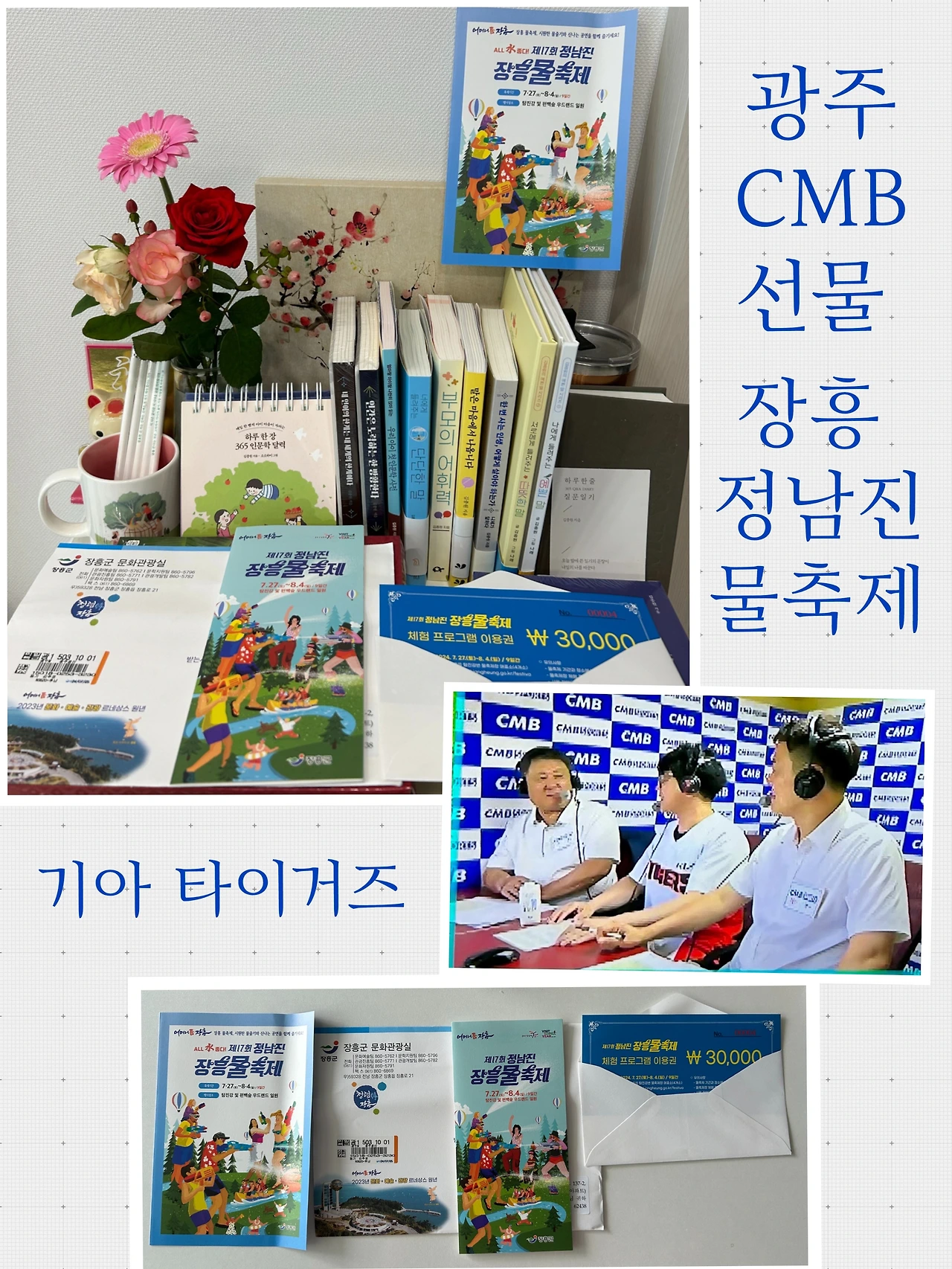 전남 장흥군 문화 관광실 주최로 7월 27일부터 8월 4일까지 9일 동안 장흥 탐진강 및 편백숲 우드랜드 일원에서 개최되는데 군수님께서 명예해설을 함께 하셨었다. 뭐 입장권은 따로 없다 보니 제17회 물축제 체험 프로그램을 이용할 수 있는 상품권으로 홍보책자와 함께 동봉해 있어 언제 올 거라는 기대 없이 도착한 광주기아 타이거즈를 응원하는 야구 중계 채널 CMB 방송국 김성한 신조한 해설 위원님께서 채택하고 PD 님께서 신상정보를 각각 전송해 선물이 하나이지만 벌써 몇 분의 손길과 마음이 담긴 것인가.
