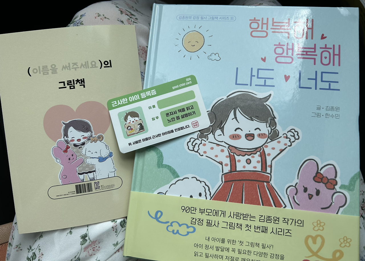 와! 온라인 서점 예스 24에서 다른 책이 출발한 줄 알았는데 이렇게 예쁜 김종원 작가님 신작 우리 아이 첫 필사 그림 동화 “행복해 행복해 나도 너도” 동화책이 집을 나서는데 문밖에 도착해 있어 반가운 마음에 깜짝이었다. 외출하려던 걸음 선채로 알라딘에서 보내온우편 상자를 개봉하는데 이 상자에도 요즘 자주 접하는 고양이 그림이 살고있다니 조선시대 숙종 임금님과영혼의 벗인 진짜 금손이가 살아 온 것 같아 행복해지는 순간을 경험한다. 귀여운 그림 책과 소중한 글이 모여 만든필사노트에 세상의 어린이들에게 보내온 근사한 어린이 명함까지 아기자기한 동화나라에 놀러나온 마음과 몸과 눈 정신까지 맑아지는 이 좋은 느낌.