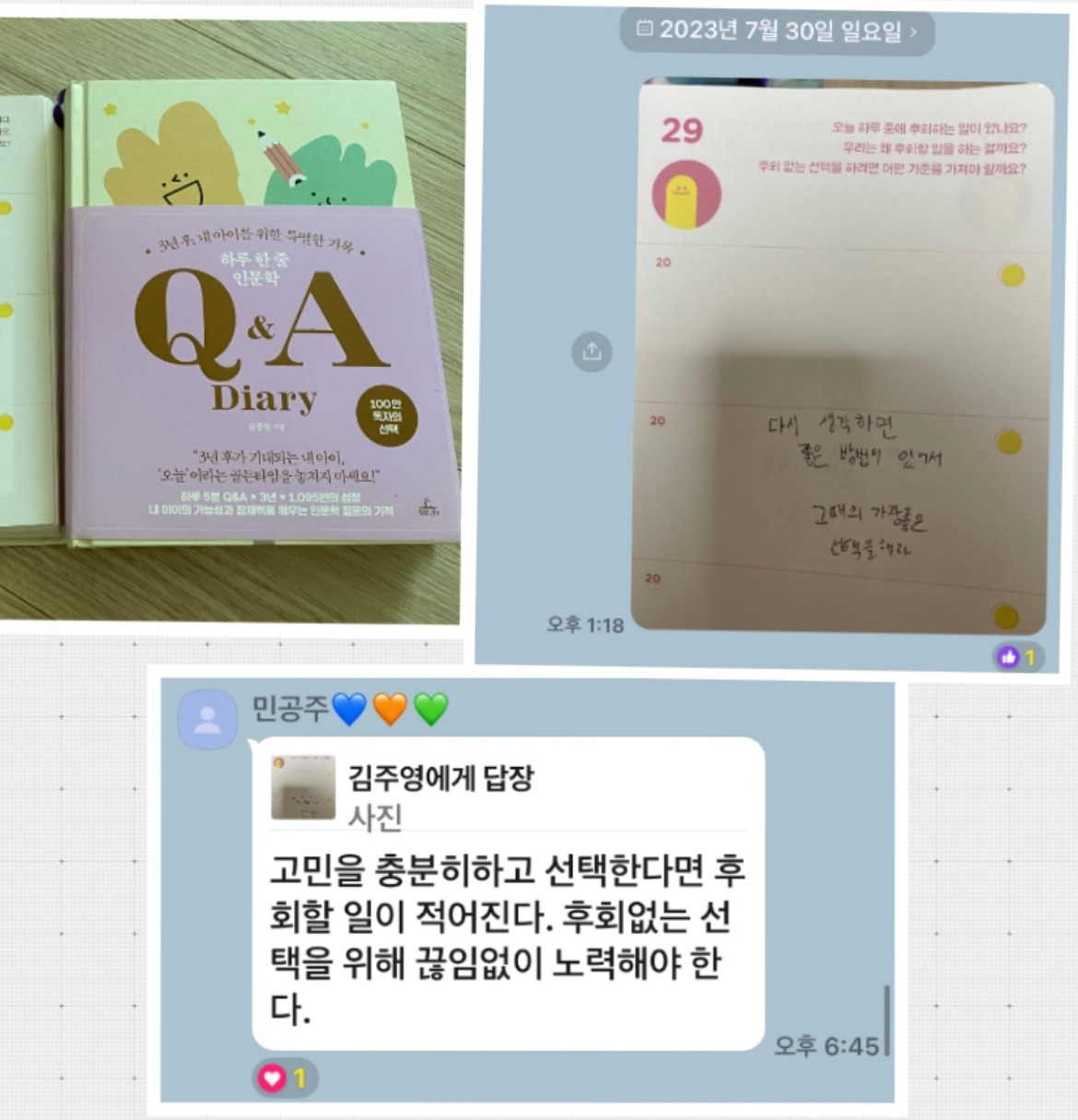 금처럼 소중한 바쁜 시간에도 김종원 조승우 작가님께서 매달 라이브소통 시간을 내주시고 각 가정에서 아이와 부모의 교환일기 쓰기를 이끌어 주시려는 데는 분명 그만의 가치가 담겨 있을 테니까. 내가 가는 길이곧 길이라는 말 항상 인문학의 대가 김종원 작가님께서 가시는 그 길을 따라 매일 걷는 마음으로 내가 살고싶은 지적 세계를 내가 가꾸며 아이와 나의 보다 나아지는 삶의 의식 수준이 성장해 간다.