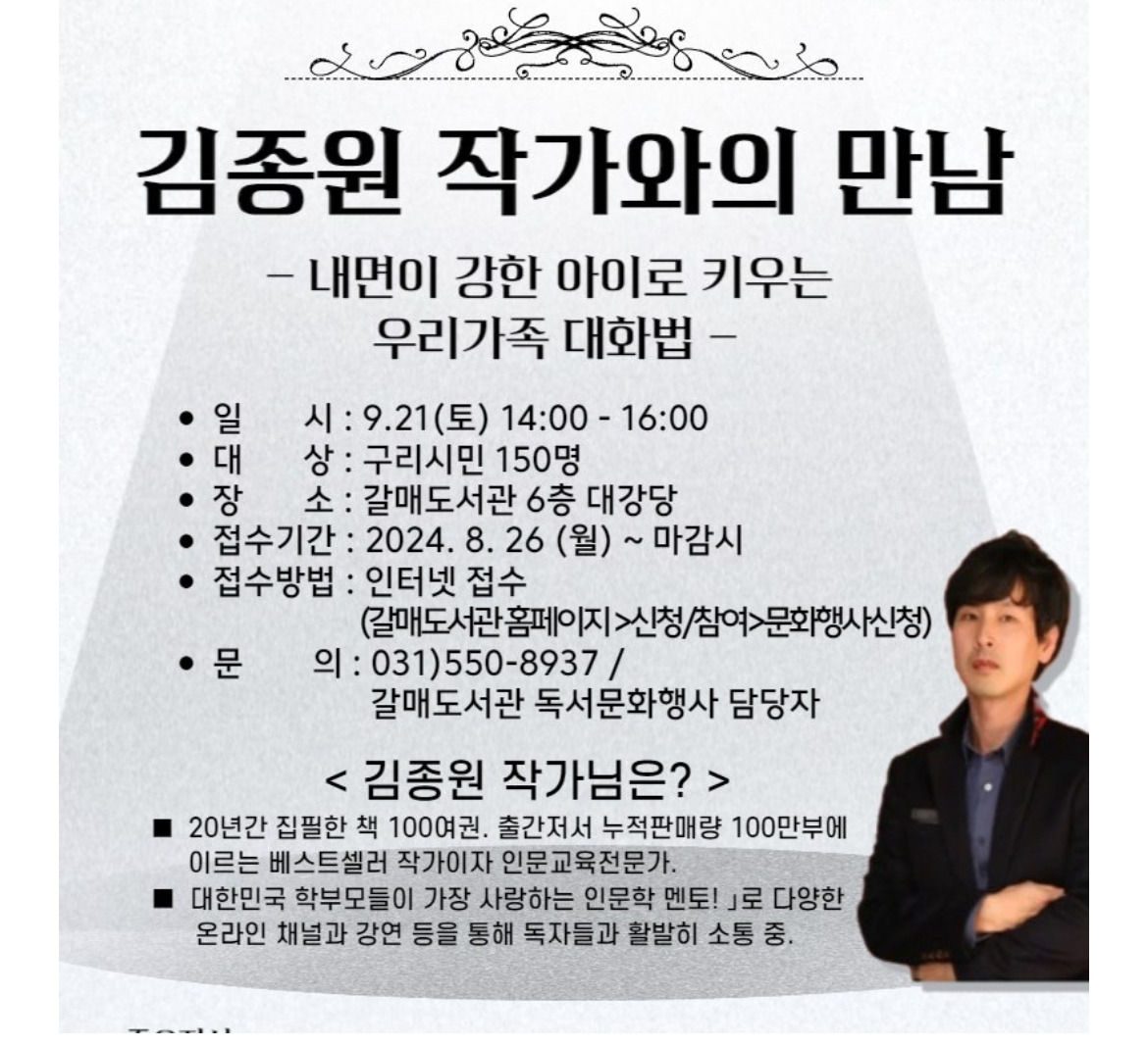 구리시 갈매 도서관 오늘 오후 2시 김종원 작가님 인문학 강의