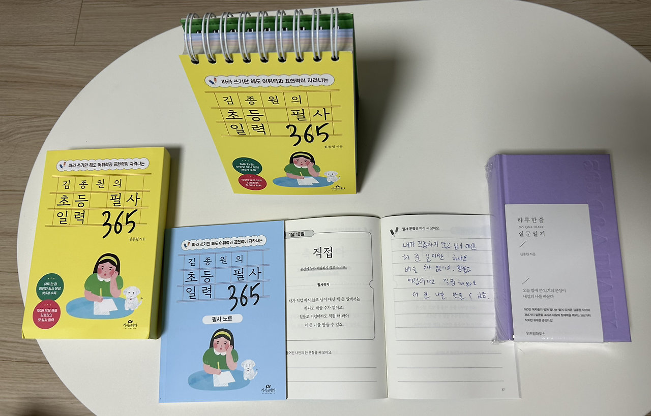그간 하루 한 장 365 인문학 일력 1권과 개정판으로 같은 글을 꾸준히 반복 하던 날 매일 아침을 여는 1분의 기적 일력으로 글칸이 좁은 게 담고 있는 글이 많아보였고 하루 한 장 365 내 아이 성장 일력으로 왠지 공부라는 개념을 강조하는 것 같은 건 내가 느껴보는 작은 느낌이지만 이번에 출간된 <김종원의 초등 필사 일력 365 일력> 의 필사 노트 및 구성의 다양성과 깊이있는 작가님의 세밀한 조화로 펼쳐질 언어와 단어의다정한 세계가 이리로 도착하는 더 공부하고 싶어지는글과의 만남이 기다려지는 멋진 느낌