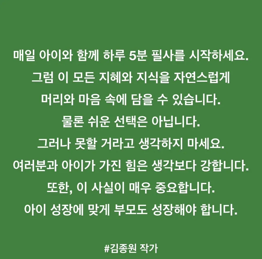 매일 아이와 함께 하루 5분 필사를 시작하세요. 그럼 이 모든 지혜와 지식을 자연스럽게 머리와 마음 속에 ...