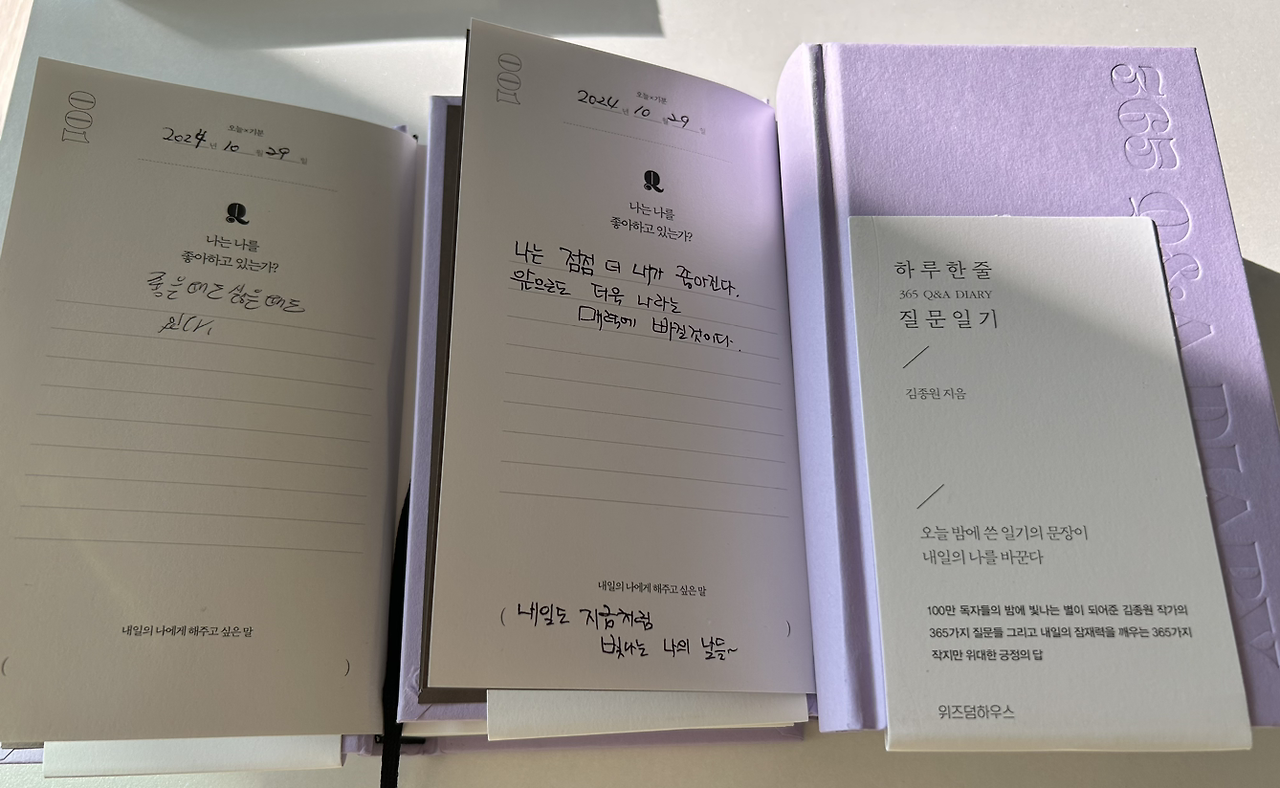 김종원 작가님 저서 <하루 한 줄 질문 일기 365 qna 다이어리> 1페이지 를 열며 나는 나를 좋아하고 있는가?라는 질문에 자신이 좋을 때도 아닐 때도 있다는 글을 본다. 왜 그렇게 생각했을까 가끔은 아니다는 생각이 들 때가 어떤 때일까 아들의 마음을 느끼는 글을 보며 나는 내가 좋다고 답장을 쓴다. 이런 나도 아닌 나도 세상에서 하나뿐인 나라서 나는 내가 좋아지는 삶을 죽는 날까지 나라서 가능한 삶을 살고 싶기 때문이다.