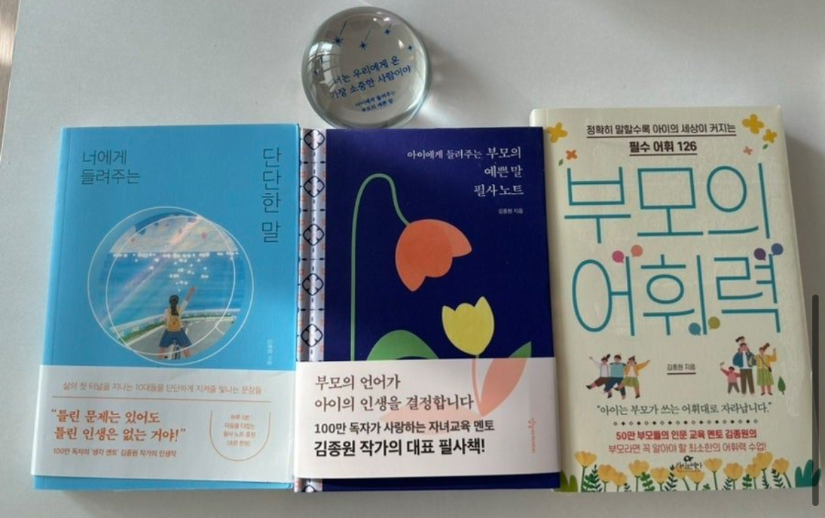 아이는 역시 새로 나온 김종원 작가님 저서 <아이에게들려주는 부모의 예쁜 말>과 <김종원의 초등 필사 일력> 책을 펼치는 나의 순간을 사진에 꼭 담아준다.
