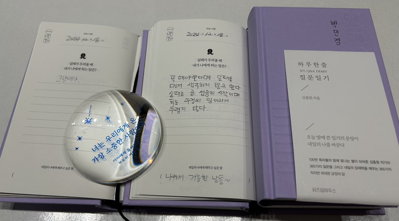 김종원 작가님 저서 <하루 한 줄 질문 일기 365 qna 다이어리> 오늘의 질문 글이 인상 깊다. 역시 아들도 이런 면이 나와 같다. 일상에서 실패라는 두려움을 미리 생각하지 않고 해야 한다면 내 걸음으로 하는 부분 말이다. 아들도 역시 거침이 없고 분명 지성의 삶으로 꾸준히 잘하고 있으니 늘 기특한 우리의 모습이며 자랑이니까.