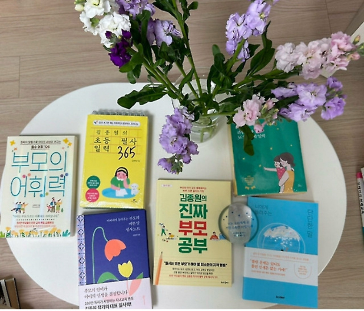 아이는 역시 새로 나온 김종원 작가님 저서 <아이에게들려주는 부모의 예쁜 말>과 <김종원의 초등 필사 일력> 책을 펼치는 나의 순간을 사진에 꼭 담아준다.