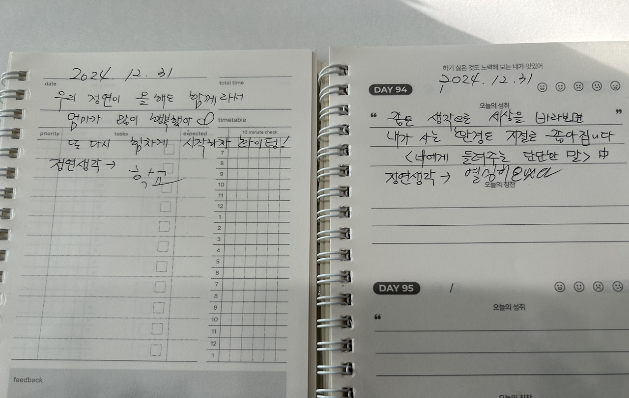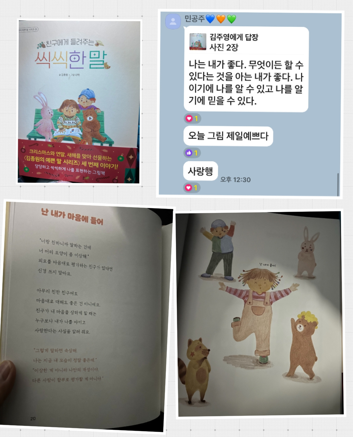새해가 밝았고 오늘 하루가 지나는 지금 이 순간 엄마의 향기를 간직한다며 엄마의 향취를 마음 속에 넣고 떠나는 큰 애와 아들 그리고 나 와 가족의 나날이 늘 자랑스럽다. 탑승해 보내온 친구에게 들려주는 씩씩한말 그림동화 필사 생각을 글로 써 전해주며 지성과의 따스한 공기를 마시는 아이와 늘 곁에서 숨쉬며 있다.
