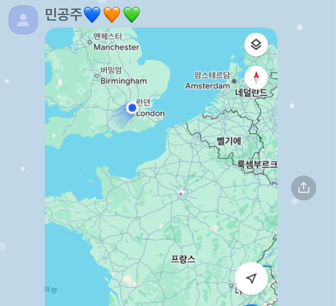 런던에서 파리까지 3시간 정도 소요되는데 아이가 지도를 보내주며 질문을 남겨준다.