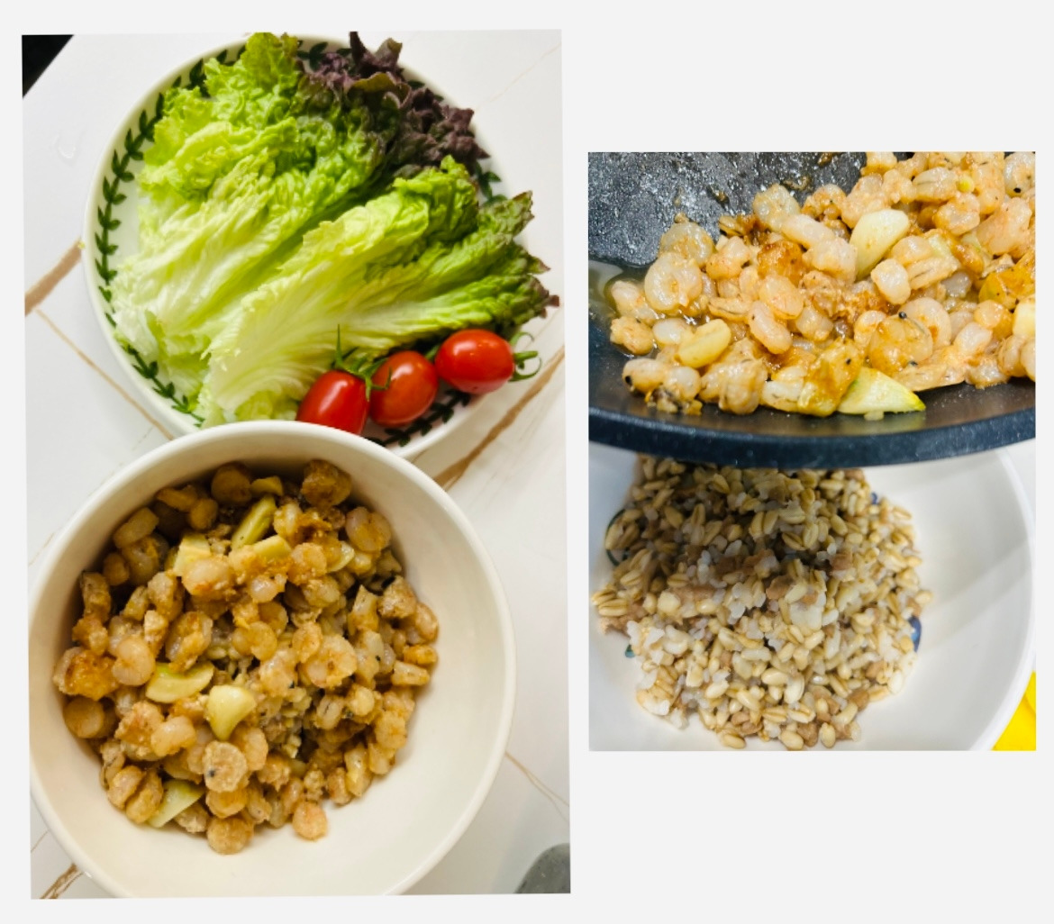 새우살, 마늘, 올리브유로 곁들인 현미 귀리 곤약밥