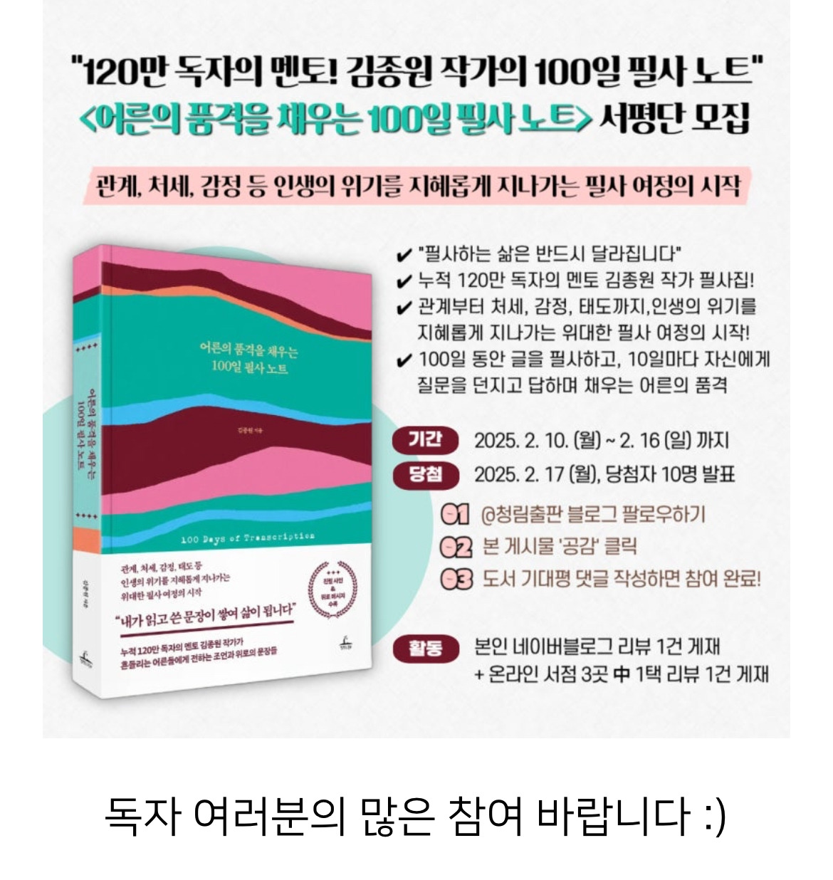 서평단모집] <어른의 품격을 채우는 100일 필사 노트> 서평단을 모집합니다! (~2/16)