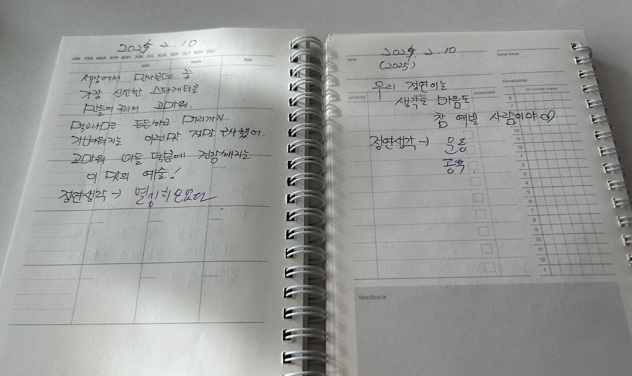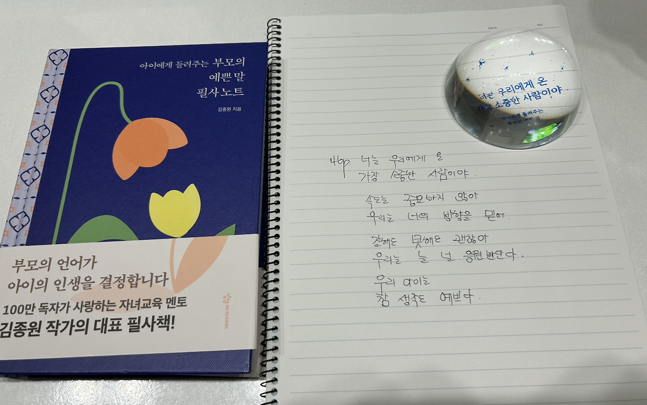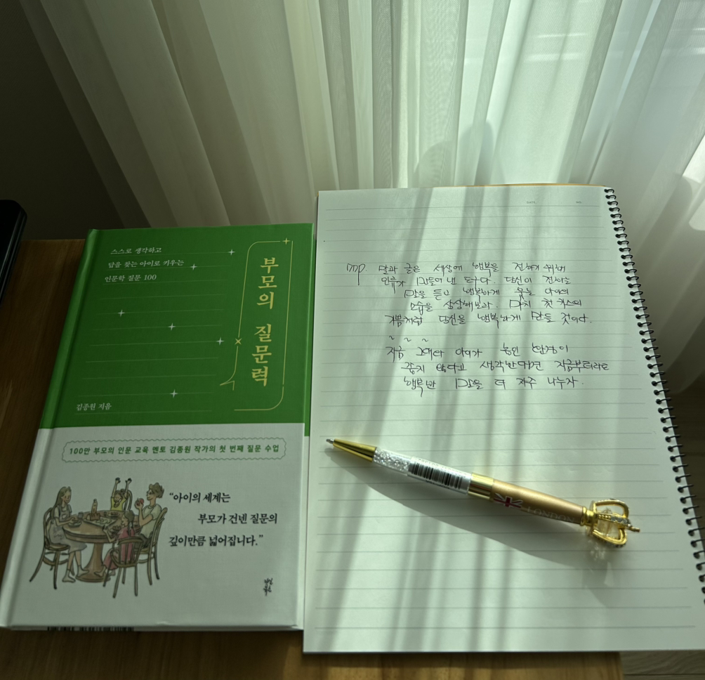 다시 2025년의 새해 봄이다. 역시 온화한 태양 빛 아래에 싱그러운 오후 4시 봄빛이 집안으로 찾아와 준 이 좋은 느낌 김종원 작가님 저서 <부모의 질문력>을 시작하며 진하게 꾹 눌러쓴 작가님의 근사한 에너지를 받으며 책장을 열어 펼친 부분에 멈추고 필사를 따라 쓰고 가장 좋은 풍경을 그리든 인증숏을 남기며 내가 해야 하는 일들을 하나씩 만나야 한다.