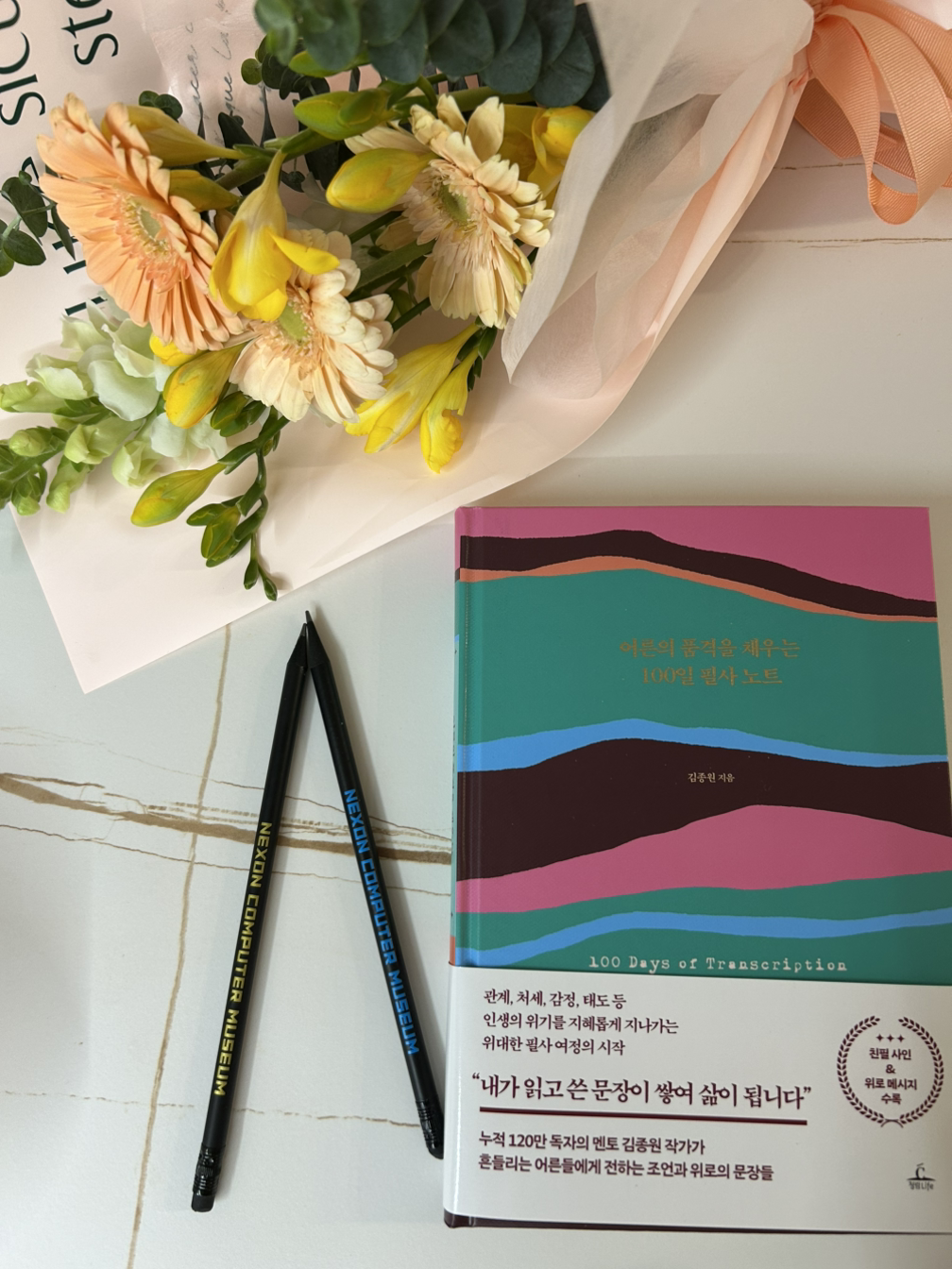 새롭고 예쁜 향기를 그리며 바로 필사할 수 있는 품격을 더하는 멋진 내 책을 펼칠 때마다 점점 기분이 사는느낌과 책의 제목 까지 금빛 문장에 집필 작가님의 글이 담긴 사인 책 오늘 친정 엄마가 받을일이 있으셔 안게 된 꽃다발을 항상 그런 것처럼 책과 함께 하라며 내게 향해주신 꽃다발까지 마치 이런 날을 계획이라도 한 것처럼 좋았다.
