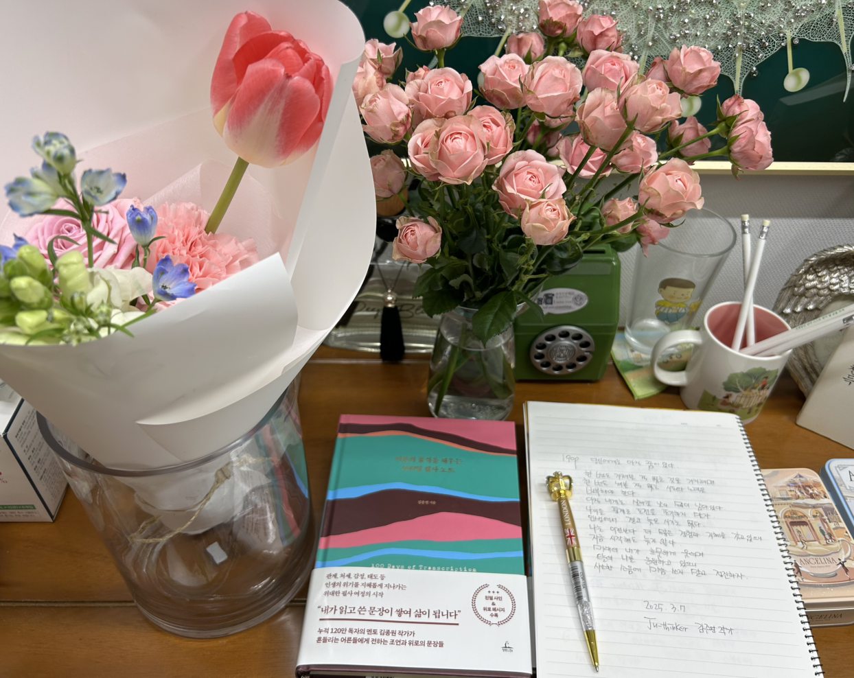 딸 한 다발 꽃 에서 몇송이를 빼 아이의 방에도 꼽아두고 엄마와 예쁨을 함께 느끼려 준비했다는 고운 아이의 새로운 근황 소식을 전해주며 꽃과 필사 책 사진 공간이 더욱 풍성해진다.