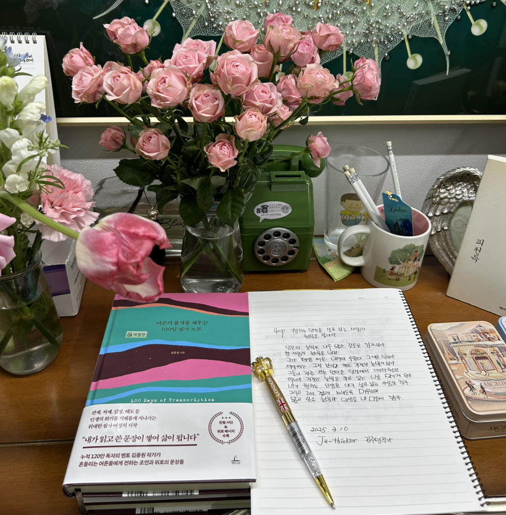 퇴근 후 아이 방에 놓인 둘째의 필사 글과 질문을 보면항상 큰돈? 에 대한 꿈이 많은 것 같다. 어떻게 돈에 다가갈지 아들이 그리는 경제의 부는 상당히 큰 것을 느끼며 신학기 바뀐 선생님과 반 친구들 교과 선생님들과의 낯섦에 조금씩 적응해 가며 학기를 시작해 가는 아들이 든든해서 내가 힘을 낸다.