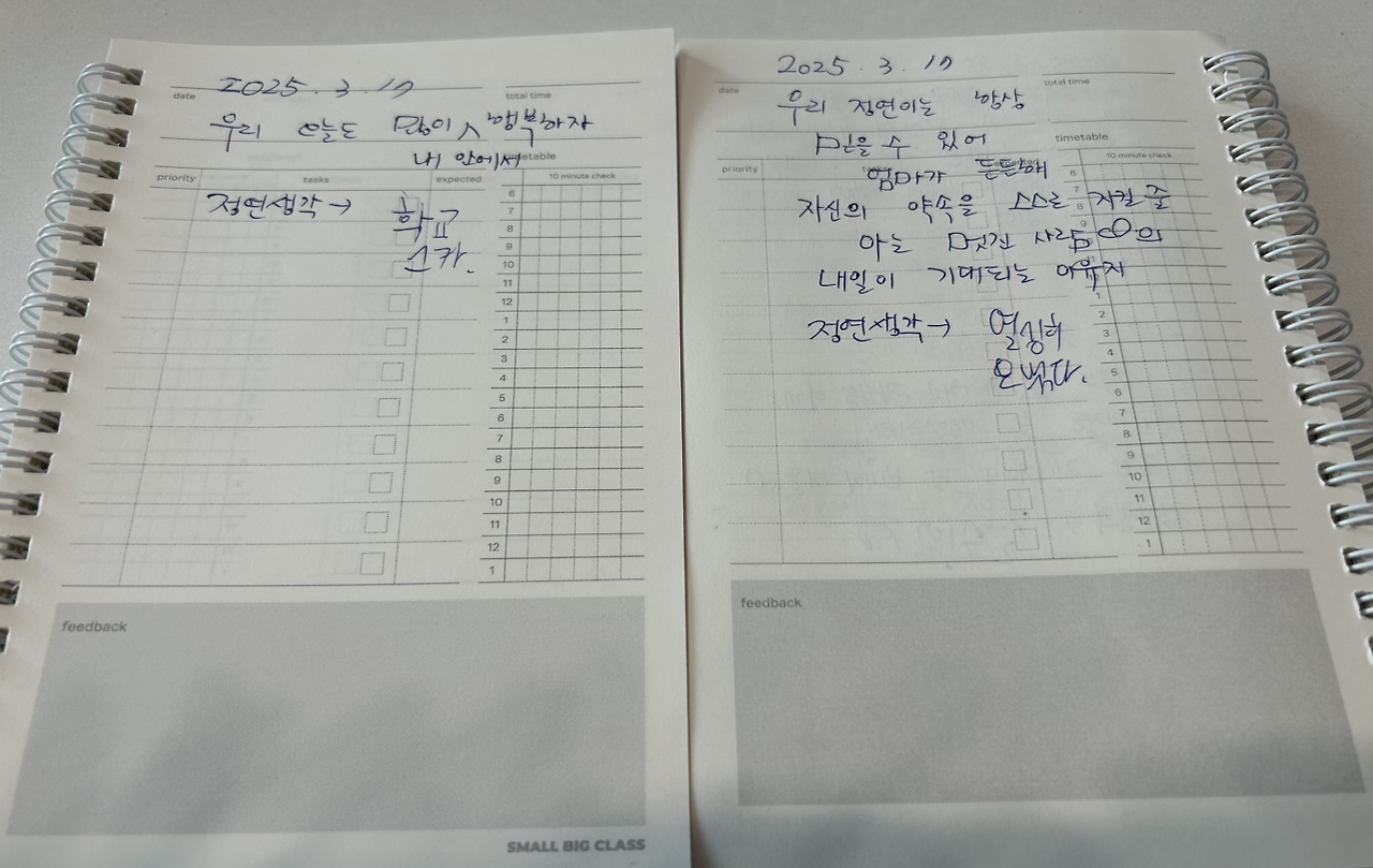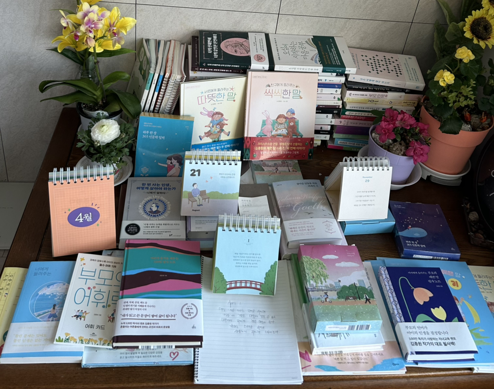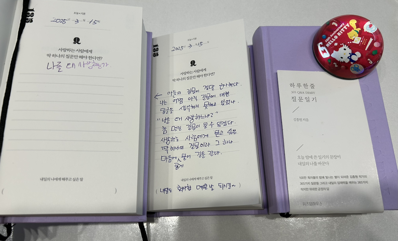 <하루 한 줄 질문 일기 365 qna 다이어리> 일기장 세 권이 거실 책상에 나란히 있는데 둘째가 밤늦게 필사하며 펼친 책이 내 일기장이었는지 책을 바꿔 교환하지 못했나 다음날 오후에 필사 노트를 기록하려고 보니 아들 필사 도구에 딱 내 다이어리가 섞여있었구나. 집에 돌아와 저녁시간에 학원을 향해야 하지만 그사이 아들은 분명 자신의 일기장에 질문과 생각길을 펼쳐갈 테니까. 그냥 그란에 자신의 글을 살짝 써도 되겠는데 아들 딸 모두 자신의 물것과 아닌 것에 분명한 건 그렇게 자랐던 자신의 것과 아닌 것을 구분해 살아온 면이 있는것 같아 어쩜 나도 그런 면이 있지 않나 싶은 마음에 고2 아들의 귀가 시간에 만나려 한다.