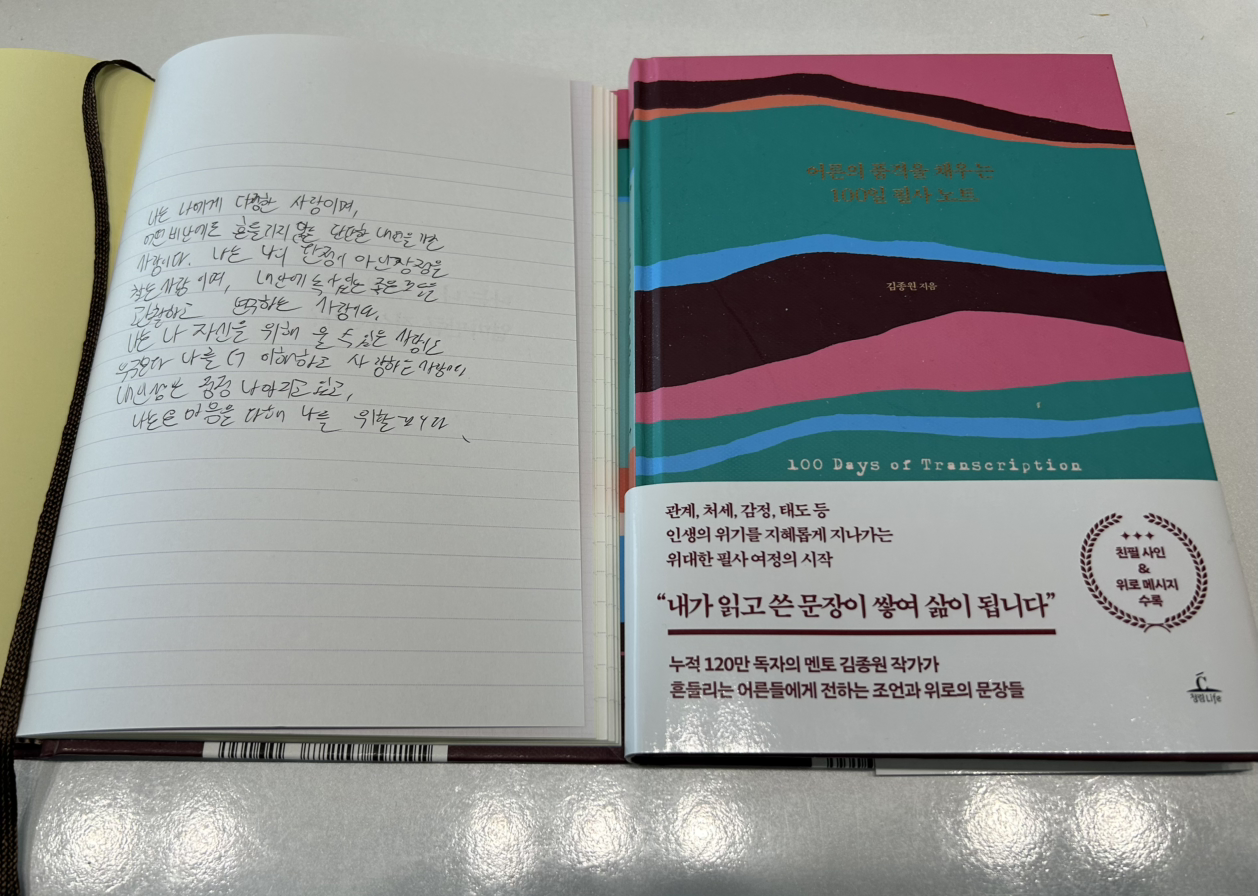 어른의 품격을 채우는 100 일 필사노트 책을 받고 형부께서 당연히 자신의 책인 줄 알고 많이 기뻐하셨다는 말 그래서 언니가 책을 더 늦게 보며 카톡이 왔다.