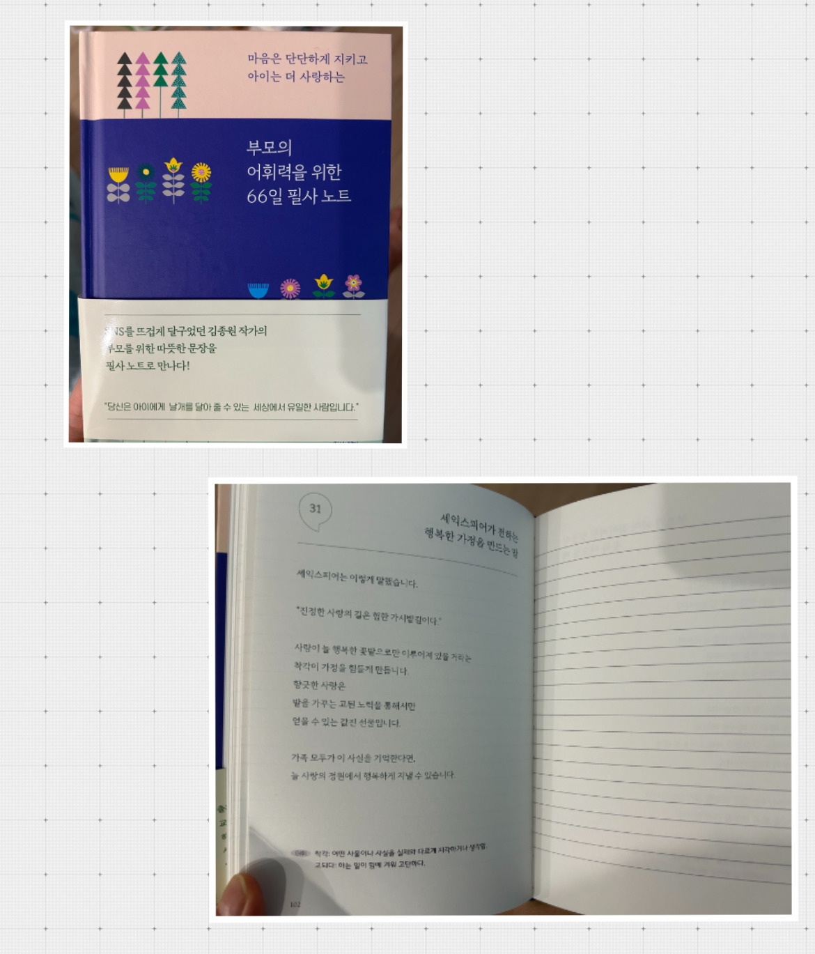 부모의 어휘력을 위한 66일 필사 노트 셰익스피어가 전하는 행복한 가정의 말 31p 를 읽고 아침에 눈을 떠 글을 바라보는 흐린 시력들 작은 깨알글을 따라 그 중 작게 쓰인 어휘라 쓰인 게 무슨 글자일까 큰 불을 켜고미간을 움츠려야 쓰인 글자를 마침내 인식해 확인해 본다.