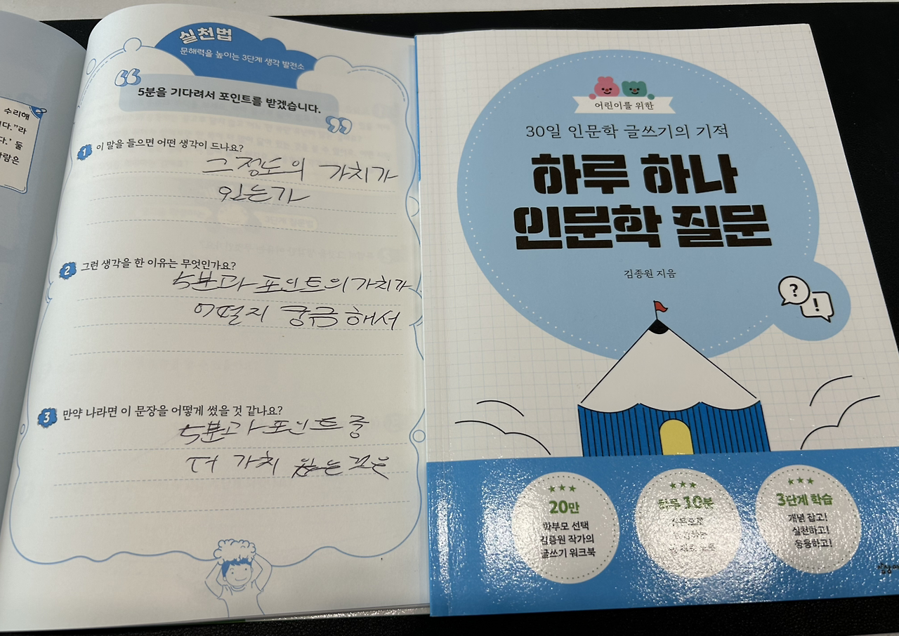 문해력을 높이는 3단계 생각 발전소 인문학 워크북 시리즈 하루 하나 인문학 질문지 과 글을 보며 아들이 꺼낸 문장의 답을 읽는 시간이 좋다. 따로 있어도 항상 아들이 안고 있던 순간이 이곳에 남아 살고 자란다.