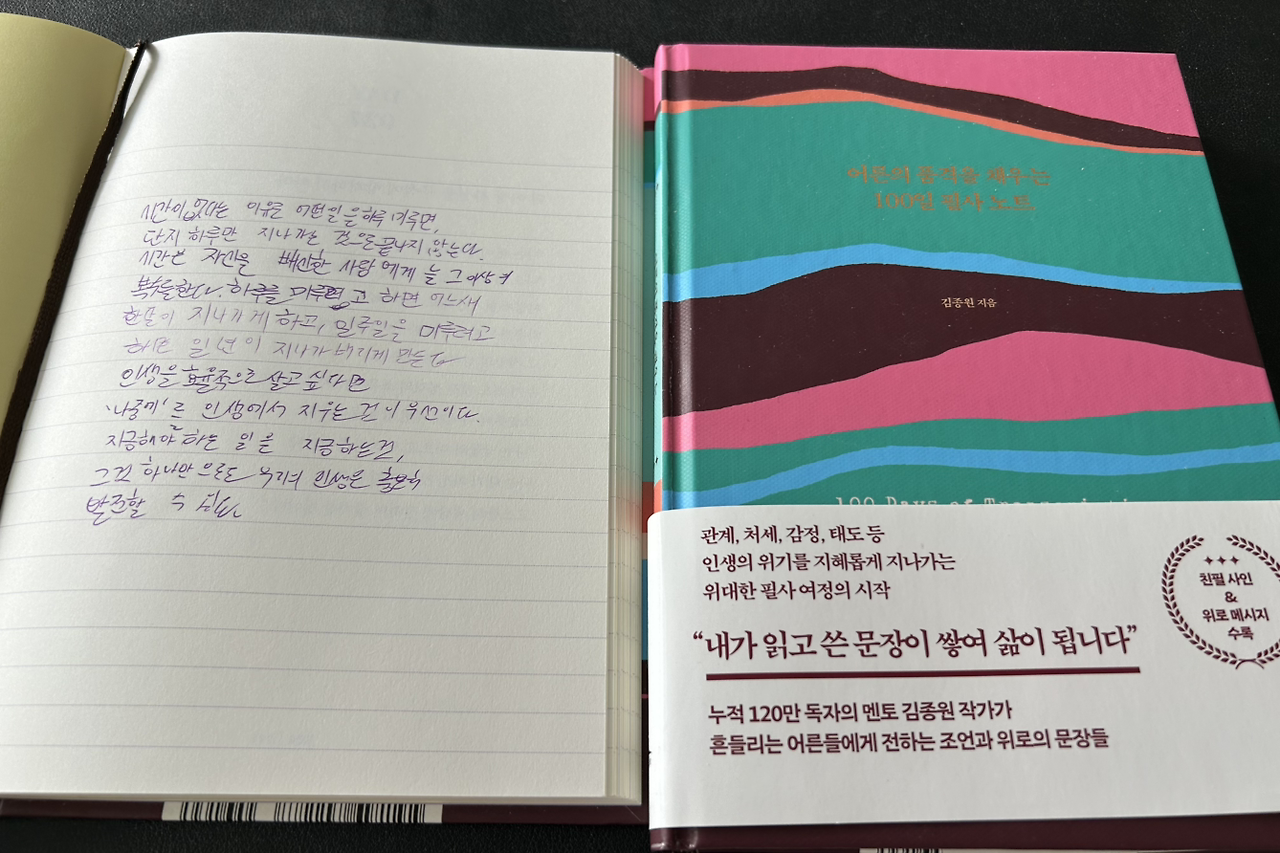 요즘 독서책으로 따라 쓰는 <어른의 품격을 채우는 100일 필사 노트> 필사본을 보며 엄마의 마음이 따스해진다. 글밥이 많을지라도 아이는 밤시간을 마무리 하며 혼자서 글과 글 길을 오가는 순간이 필사 노트에 남겨있어 세상에서 가장 멋진 아이의 시간에 만날 수 있는 지성이 있다는 게 얼마나 향긋한 일인지 다시한번 책과 교류하는 아들의 시간을 응원하며 책과 글을 내가 느끼며 필사 기록을 다시금 정리해 간다.