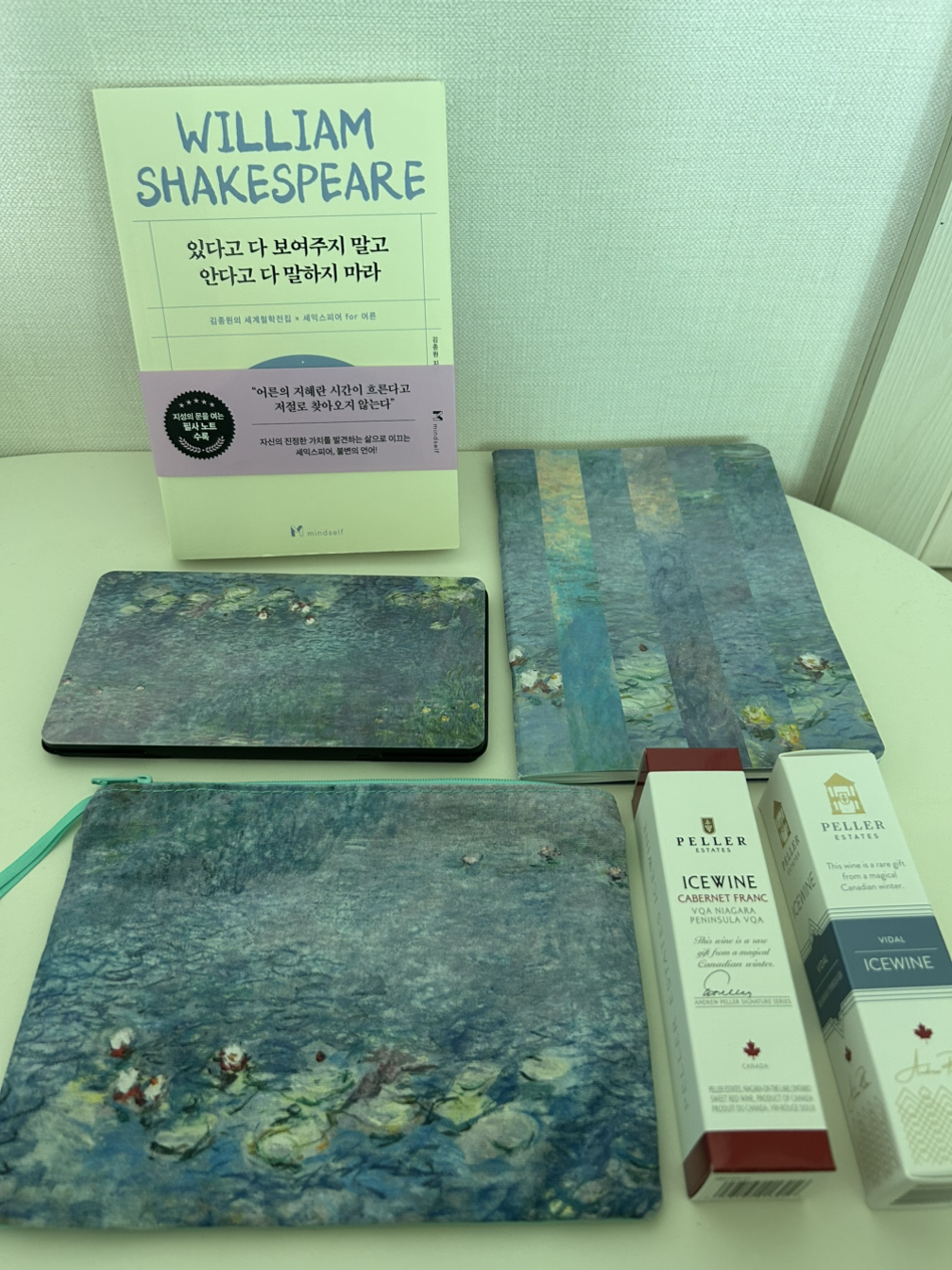 프랑스 파리 오랑주리 미술관에서 건너 온 색연필, 메모 노트, 파우치에는 모네의 수련 작품 그림의 옷을 입고 있다.큰 애가 떠난 해외 문화 장학 연수에서 자신의 물건보다 모네의 수련관에서 주고싶은 엄마를 생각해 고른 마음이 실린 선물이라는 게 모네의 생애와 작품 세계를 따라 더 없이 함께 하는 오늘의 하루 하루들.
