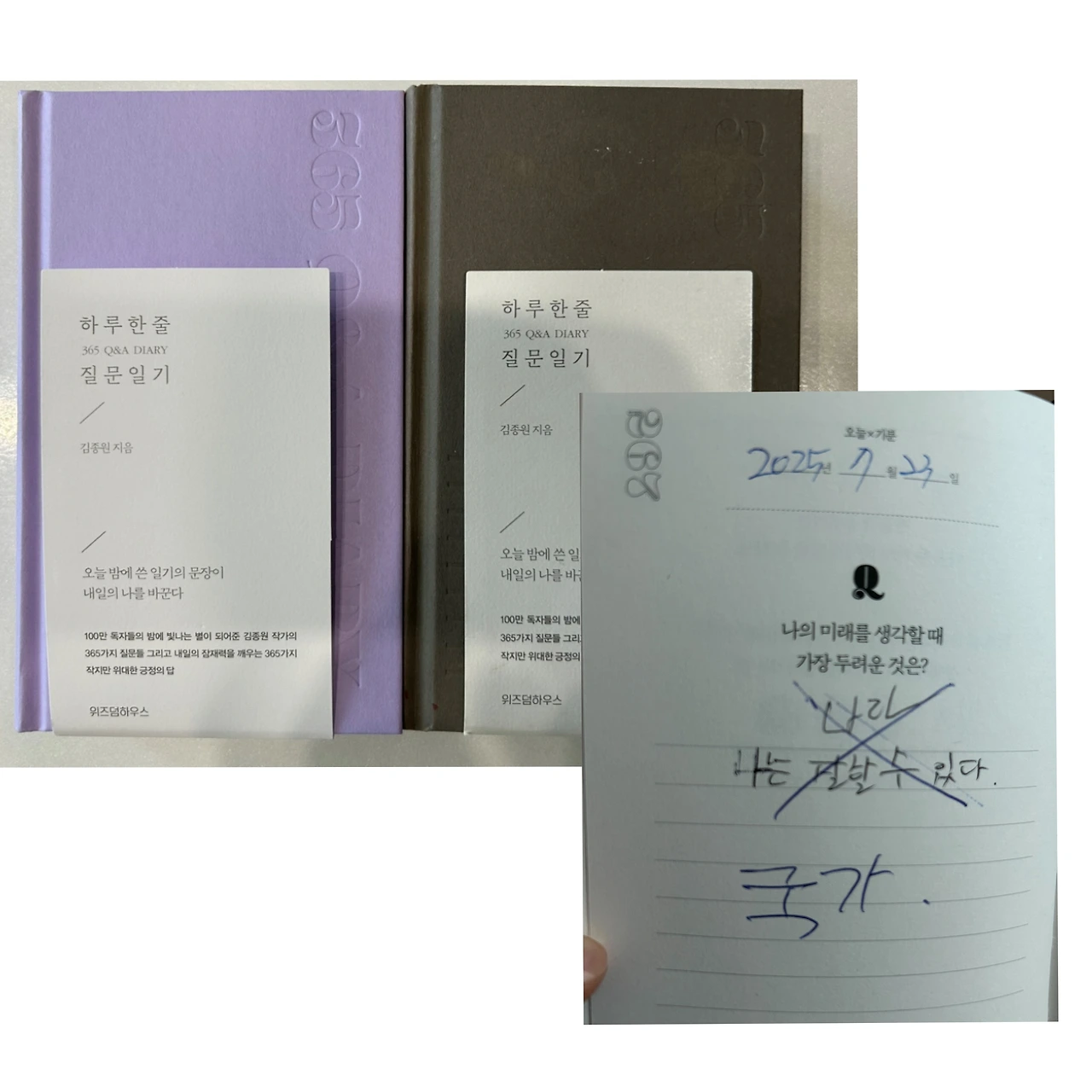 며칠 전 밤새 써 둔 둘째의 다이어리 하루 한 줄 질문 일기 365 Q&A 다이어리의 질문에 대한 기록 글을 보고 자신의 미래를 생각할 때 가장 걱정되는 것이 ‘나다’라고 읽었고 한편 그럴 리가 다시 아들에게 힘찬 응원의 문구로 나는 잘할 수 있다는 문장을 써 둔걸 아들이 다음날 읽고 전화가 왔다.